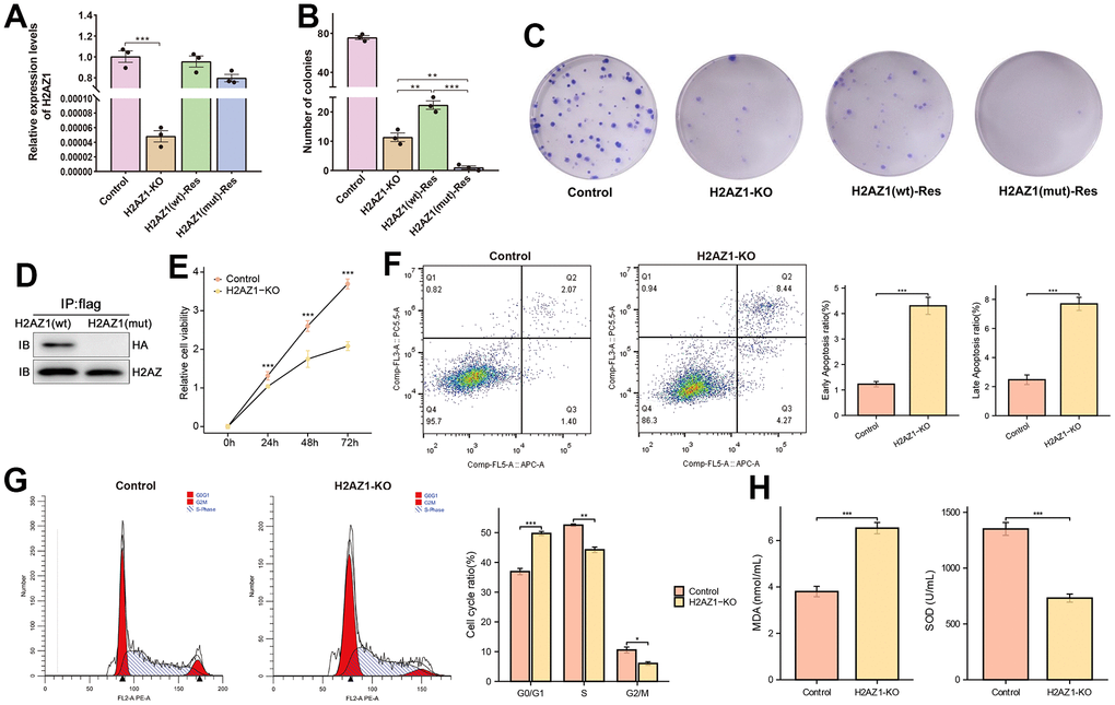 Subsequently, we conducted CCK8 proliferation, cell cycle, and apoptosis assays to verify the biological effects of H2AZ1 on HCC cells. The cellular experiments showed that H2AZ1 knockdown increased apoptosis ratio and altered cell cycle transitions in HCC cells (Figure 8E–8G). Moreover, H2AZ1 knockdown resulted in a decrease in superoxide dismutase (SOD) activity and an increase in malondialdehyde (MDA) levels, suggesting that changes in H2AZ1 expression could affect oxidative stress in tumor cells (Figure 8H).