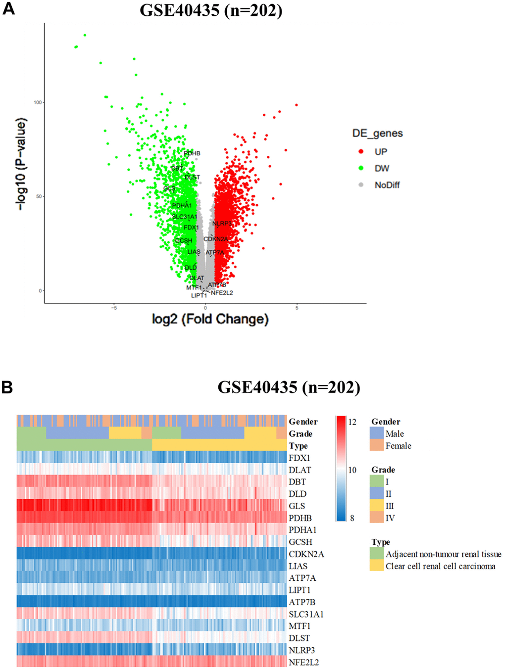 In our comprehensive study, we utilized data from the clear cell renal cell carcinoma (ccRCC) database GSE40435, which includes information from 202 patients. Our objective was to analyze and compare the expression patterns of cuproptosis-related genes (CRGs) in normal kidney tissues versus ccRCC tissues across various disease stages and between male and female patients. This analysis is visually summarized in Figure 2 of our report. Our findings revealed a complex pattern of gene expression changes in ccRCC. We observed both overexpression and downregulation of CRGs in these cancer tissues. Specifically, the NLRP3 and ATP7A genes showed overexpression, while CDKN2A was notably upregulated. In contrast, a significant downregulation was seen in several key genes, including SLC31A1, FDX1, LIAS, DLD, DLAT, PDHA1, PDHB, GLS, DBT, GCSH, and DLST (P < 0.001, as shown in Figure 2A). Furthermore, we explored the correlation between gene expression and the stage of ccRCC. Our analysis indicated that the expression of NLRP3 and CDKN2A genes positively correlated with the advancement of ccRCC stages (P < 0.05). On the other hand, LIAS and GLS gene expression showed a negative correlation with the disease stage (P < 0.05 and P < 0.01, respectively, as depicted in Figure 2B). Intriguingly, we also discovered a significant difference in GLS gene expression between male and female patients with ccRCC (P < 0.01, illustrated in Figure 2C). The patterns of gene expression observed in our study suggest that CRGs play a crucial role in the development and progression of ccRCC. The significant alterations in the expression of these genes, particularly their correlations with cancer stage and variations between sexes, underscore their potential as targets for therapeutic intervention and as biomarkers for the diagnosis and prognosis of ccRCC. These findings pave the way for further research into the molecular mechanisms of ccRCC and the development of targeted treatments based on the modulation of CRGs.