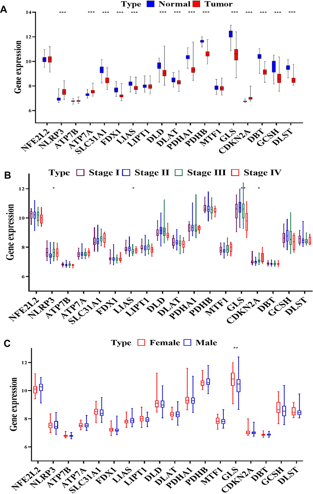 Gene expression of CRGs between normal tissues and tumors by stage and sex in ccRCC