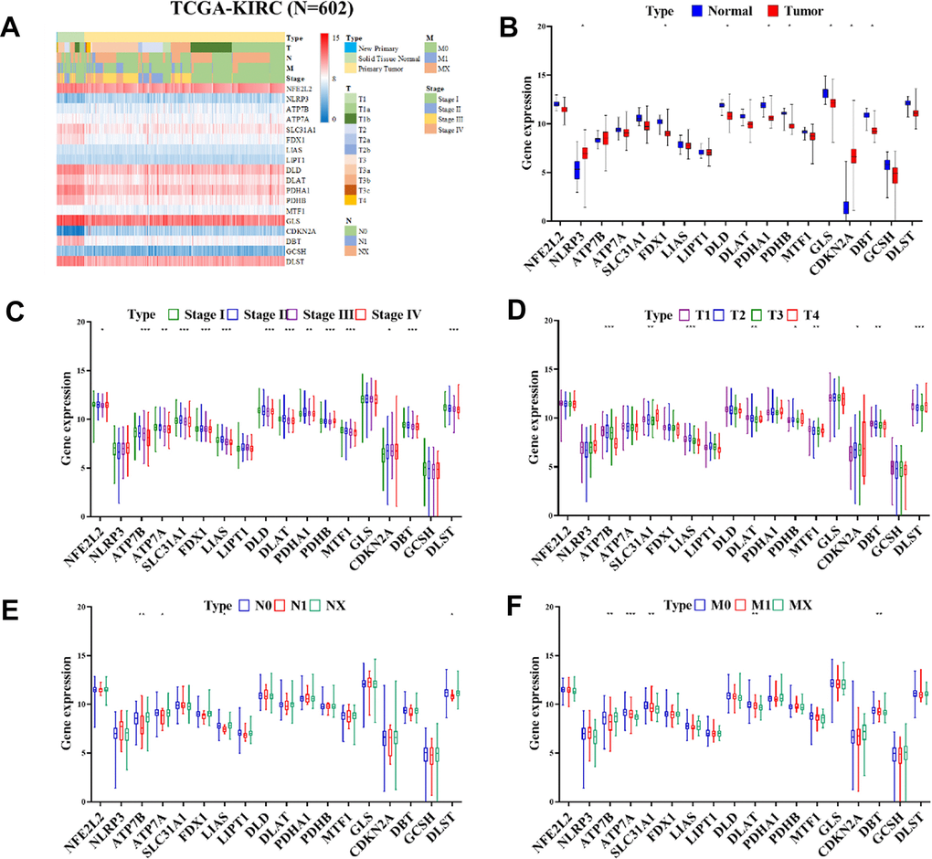 In our comprehensive analysis, we focused on the expression patterns of copper CRGs within a specific ccRCC cohort. Our findings revealed a significant variation in the expression of CRGs in ccRCC tumors, with this differential expression becoming more pronounced in tumors that were at an advanced stage (as depicted in Figure 1). This notable disparity in CRG expression was further corroborated by our observations in the TCGA-KIRC cohort. Here, we noticed a strong association between elevated levels of CRG expression and more advanced tumor stages, as well as higher TNM stages (illustrated in Figure 2).