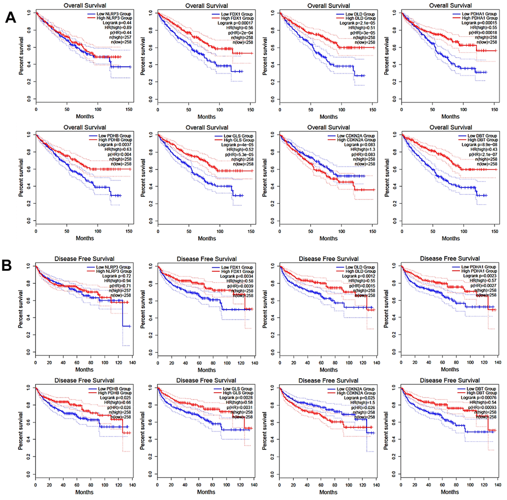 The in-silico analysis of the TCGA-KIRC (The Cancer Genome Atlas - Kidney Renal Clear Cell Carcinoma) cohort reveals a significant association between certain cancer-related genes (CRGs) and the outcomes of patients with renal cell carcinoma (RCC). Specifically, this study focused on genes such as FDX1, DLD, PDHA1, PDHB, GLS, and DBT. The analysis demonstrated that patients with RCC who have lower expression levels of these CRGs tend to experience worse overall survival (OS) outcomes compared to those with higher CRG expression levels. This correlation was statistically significant, as indicated by a P-value of less than 0.05, as shown in Figure 4A. Furthermore, the study also investigated the impact of CRG expression levels on disease-free survival (DFS), which is the period after treatment during which no disease is detected. It was found that patients with lower expression of certain CRGs, namely FDX1, DLD, PDHA1, PDHB, GLS, CDKN2A, and DBT, had significantly worse DFS outcomes. This finding was also statistically significant (P < 0.05), as illustrated in Figure 4B. This evidence suggests that the expression levels of these specific genes could potentially be used as biomarkers to predict survival outcomes in RCC patients. The results underscore the importance of CRGs in the pathogenesis and progression of RCC and provide valuable insights for potential therapeutic strategies and prognosis prediction.