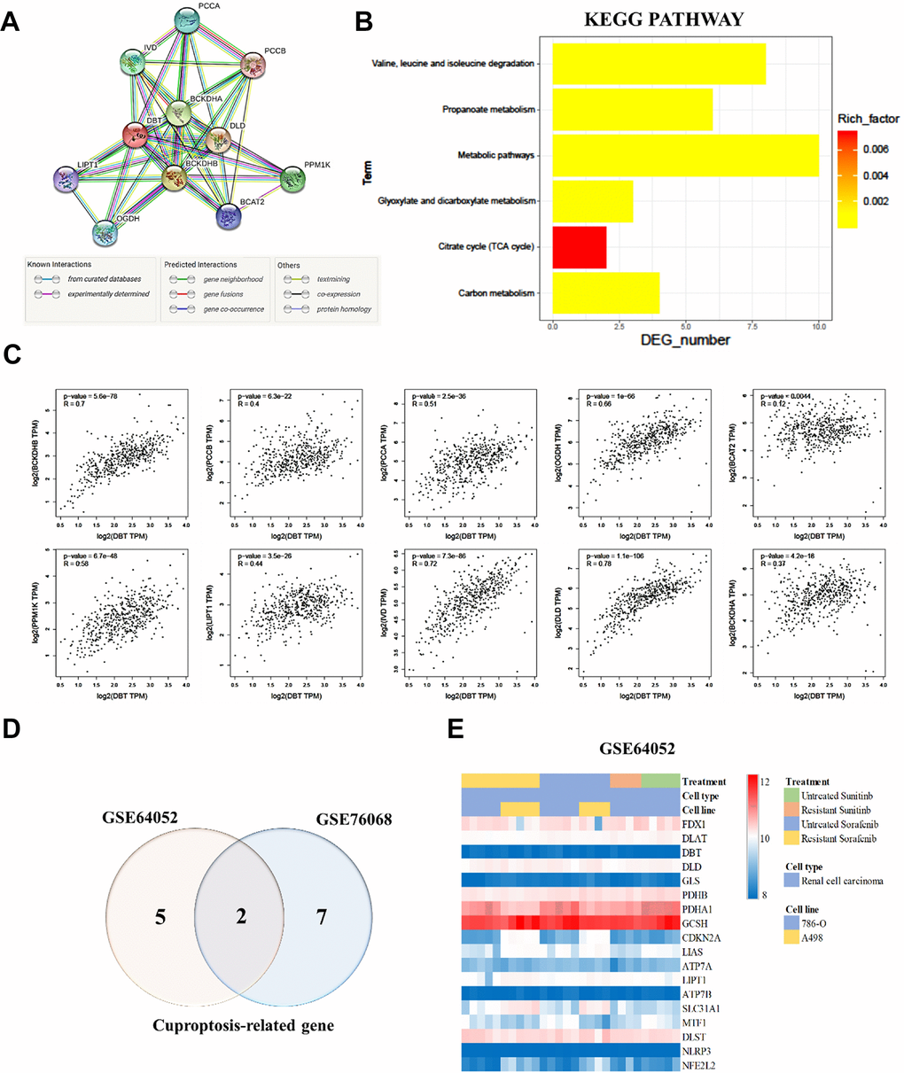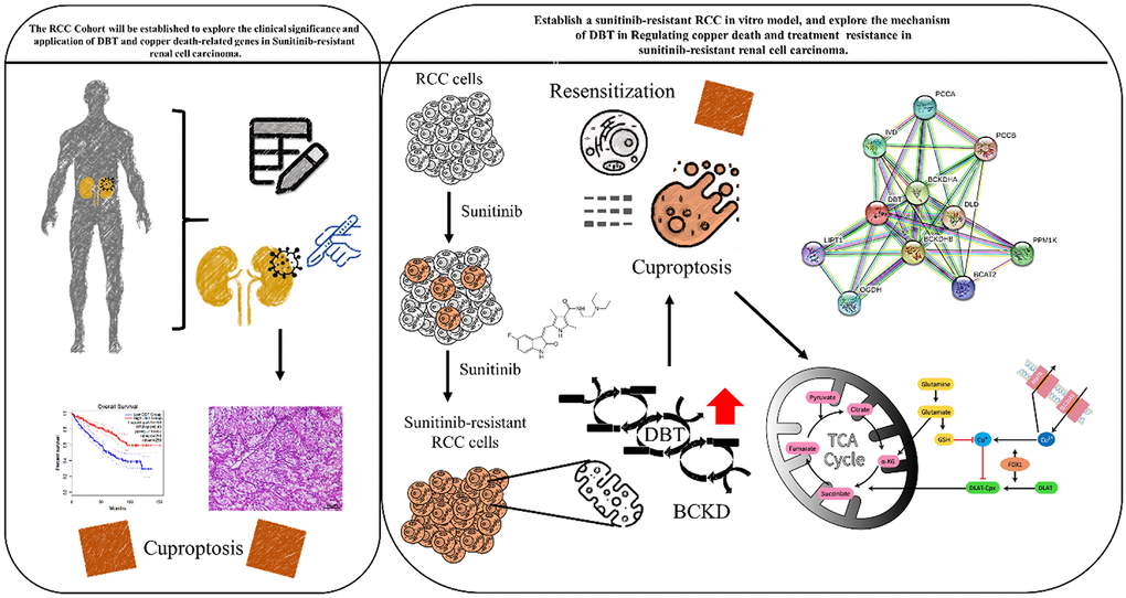 Figure 7 presents a graphical abstract illustrating the research project's execution. This project aims to shed light on the impact of cuproptosis in the progression of Renal Cell Carcinoma (RCC) and to unravel the molecular mechanisms underlying drug resistance. The ultimate goal of this study is to pave the way for the development of innovative therapeutic approaches for the treatment of drug resistant RCC. This study aims to determine the significance of dihydrolipoamide branched chain transacylase E2 (DBT) in patients with Sunitinib-Resistant Clear-Cell Renal Cell Carcinoma (RCC). We found that DBT expression is reduced in various cancers, and in RCC, low DBT levels are associated with advanced disease characteristics and poor prognosis. The study examined DBT's predictive value in various cancers, highlighting its significant prognostic importance in RCC, leading to further investigations. Through comprehensive bioinformatics analysis, we explored the relationship between DBT and clinicopathological features in RCC patients. Our findings indicate a significant reduction in DBT expression in RCC, correlating with disease progression and lower survival rates. Experimental results showed that DBT overexpression inhibited RCC cell growth, migration, and invasion. Moreover, we uncovered DBT's role in the tumor immune environment, suggesting that DBT may contribute to cancer development by initiating abnormal inflammatory and immune reactions. This research enhances our understanding of RCC pathophysiology and potential molecular targets.