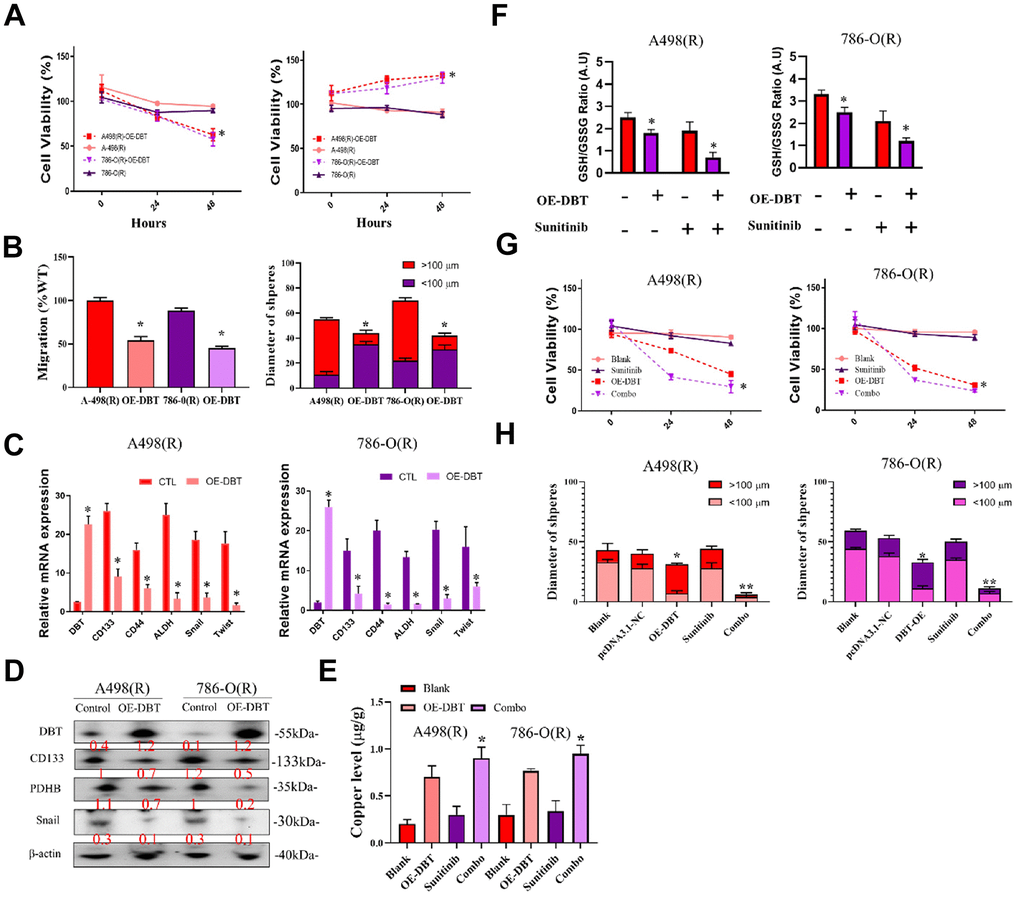 We first manipulated DBT-KD or DBT overexpression and examined the subsequent transcriptome changes to discover novel effectors in DBT-regulated gene axes. RNA from cells with DBT overexpression or DBT knockdown was extracted and subjected to microarray analysis. Transcripts that exhibited similar changes in both groups were selected for subsequent functional assessment. Ingenuity pathway analysis and gene ontology analysis was subsequently performed to functionally classify the identified genes, enabling the researchers to identify potential genes that play a role in cell motility, extracellular matrix adhesion, or metastasis. Real-time RT-PCR was then performed in DBT-manipulated cells to validate the changes observed during microarray analysis. For genes known to be involved in regulating cell migration or metastasis, reporter constructs were generated and analyzed to determine DBT dependence. The ultimate goal of this process was to narrow down the candidate genes to a small set of key genes for subsequent evaluation. To delve deeper into the biological functions of DBT in kidney cancer, specifically in kidney renal clear cell carcinoma (KRCC), we conducted a detailed examination of DBT's mRNA and protein levels in two renal cell carcinoma (RCC) cell lines: 786-O and A498. This analysis utilized RT-qPCR and Western blotting techniques. Given the relatively low expression of DBT, we employed overexpression plasmid (OE-DBT) and a control plasmid (pCDNA3.1) for transfection into Sunitinib-resistant 786(R)-O and A498(R) cell lines, thereby amplifying DBT expression. Our findings, as depicted in Figure 6A, revealed the impact of this overexpression on the cell viability in these sunitinib-resistant RCC cell lines. To further assess the functional implications of DBT overexpression, we executed wound healing assays and tumor sphere formation tests. The results, observed 24 hours post-scraping, indicated a marked reduction in the migration rate of the DBT-overexpressing (OE-DBT) cells compared to control RCC cells. Additionally, the OE-DBT cells demonstrated a decreased capability in forming tumor spheres, as shown by the reduced diameter of these spheres (Figure 6B). We validated the efficiency of the transfection and the consequent alterations in gene regulation related to copper apoptosis and cell function through both RT-qPCR (Figure 6C) and Western blot (Figure 6D). The intracellular levels of copper ions, crucial for understanding the underlying mechanisms, are illustrated in Figure 6E. GSH acts as a thiol-based chelator of copper, inhibiting cuproptosis. Being a natural chelator of intracellular copper ions, a reduction in GSH levels corresponds with a rise in intracellular copper concentration. This is illustrated in the GSH/GSSG Ratio Assay presented in Figure 6F. Furthermore, our experiments suggest that combining treatments can restore sensitivity in drug-resistant cells while simultaneously reducing both the diameter of tumor sphere formation and overall cell viability (Figure 6G, 6H). This comprehensive approach sheds light on the significant role DBT plays in the cellular processes of RCC, highlighting its potential as a therapeutic target in the treatment of RCC.