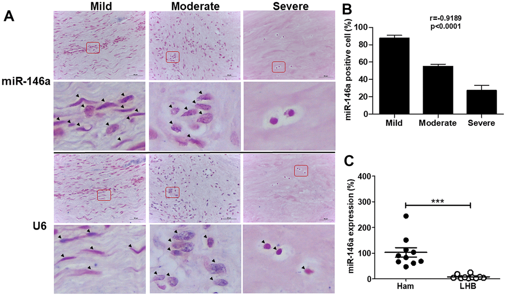 To examine the role of miR-146a in tendinopathy progression, we assessed miR-146a expression in tendinopathic long head biceps (LHB) tendons by in situ hybridization (Figure 1A) and quantitative reverse transcription polymerase chain reaction (qRT-PCR) (Figure 1C). The histological sections of LHB tendons were graded from mild to severe based on a semiquantitative scoring system [3, 11]. MiR-146a exhibited strong staining in tenocyte-like cells in the mild grade sections but was rarely observed in chondrocyte-like cells in the severe grade sections (Figure 1A). Quantitative analysis demonstrated a negative correlation between miR-146a expression levels and the histological grades of tendinopathy, indicating reduced miR-146a expression with disease progression (r = -0.8563, p<0.001, Figure 1B). Additionally, we observed lower miR-146a expression in tendinopathic LHB tendons compared to normal hamstring tendons (Figure 1C).