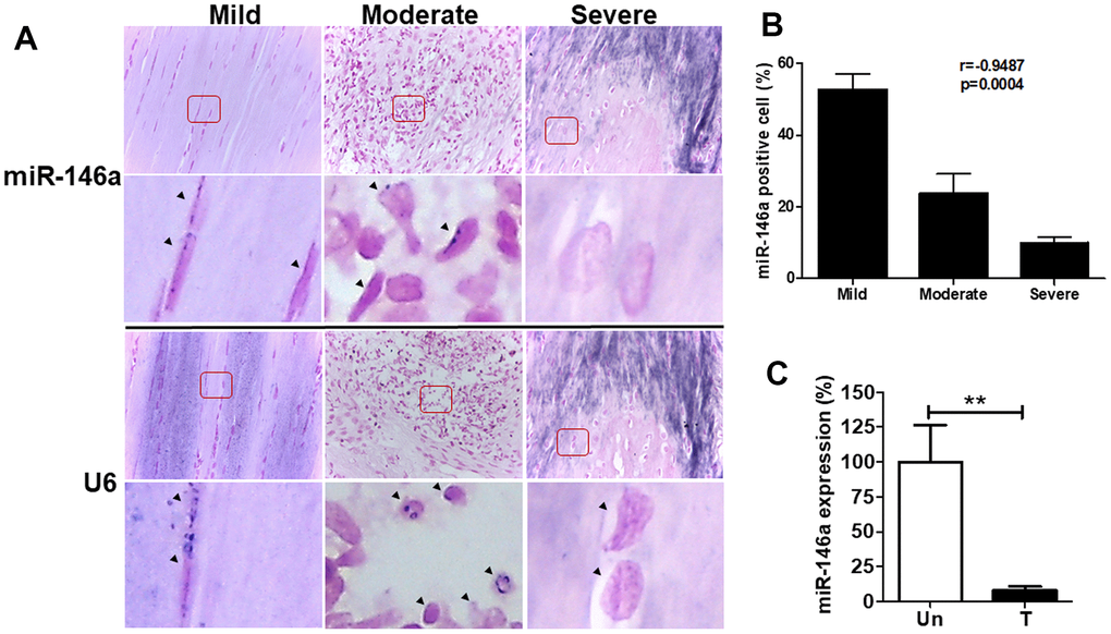 We cultured primary rat tendinopathic tenocytes from Achilles tendons treated with collagenase for one week, following established protocols [3, 11]. Additionally, we utilized a rat collagenase-induced tendinopathy model based on previous studies [11, 23]. Similar to human tendons, rat miR-146a exhibited strong staining in tenocyte-like cells in the mild grade sections but was rarely observed in chondrocyte-like cells in the severe grade sections (Figure 2A). Quantitative analysis indicated a negative correlation between miR-146a expression levels and the histological grades of tendinopathy (r = -0.9487, p<0.001, Figure 2B). In our cell model, we isolated tenocytes from rat Achilles tendons and categorized them as treated (T) or untreated (Un) following intratendinous injection of collagenase [3, 11]. Treated tenocytes exhibited significantly lower miR-146a expression levels than untreated control tenocytes, as determined by qRT-PCR (Figure 2C).