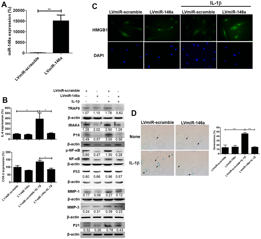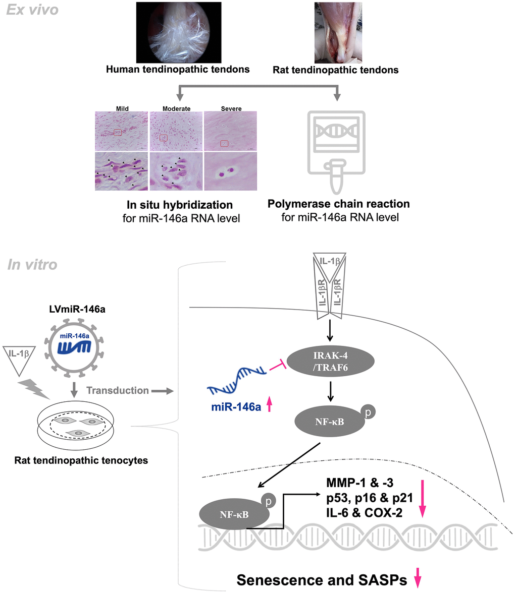 In this study, we demonstrated for the first time that miR-146a expression was negatively correlated with the severity of tendinopathy in human and rat tendons (Figures 1, 2). Over-expression of miR-146a by lentivirus-mediated gene transfer ameliorates senescence and SASPs in IL-1β stimulated tendinopathic tenocytes through reducing the levels of IRAK-4 and TRAF6, as well as enhancing nuclear localization of HMGB1. Furthermore, expression level of the inflammatory mediator, phospho-NF-ĸB was also decreased in the present experimental settings (Figure 3).