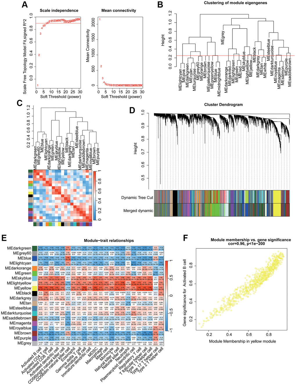 According to the 23 types immune cell signatures, we utilized the “GSVA” package to estimate the Single Sample Gene Set Enrichment Analysis (ssGSEA) score of 23 types immune cells proportion (Supplementary Table 1). Based on the “WGCNA” script, a WGNCA related model was constructed to identify the pivotal immune cell associated gene module. In first, an all-sample clustering tree was established to remove the abnormal samples and calculate the optimal soft threshold (β) to build the WGCNA. Utilizing the Pearson correlated algorithm, the potential association of each gene module and immune cells was evaluated and the most related gene module was selected for the final analysis.