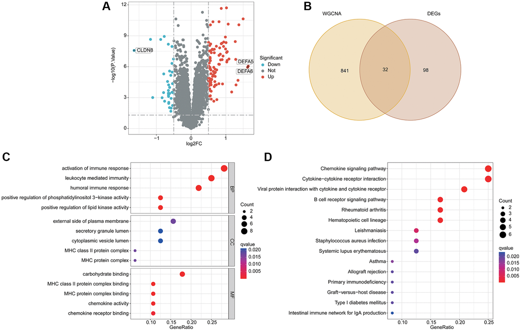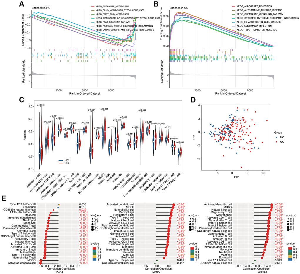 With the selection threshold set at |FC| > 1.4 and p.adjust < 0.05, the DEGs between HC and UC groups were identified. “clusterProfiler” package was utilized to explore the potential molecular function of GO and KEGG terms. Based on the reference of “c2.cp.kegg. v7.4.symbols”, a Gene Set Enrichment Analysis (GSEA) was carried out to predict the KEGG terms of HC and UC groups.