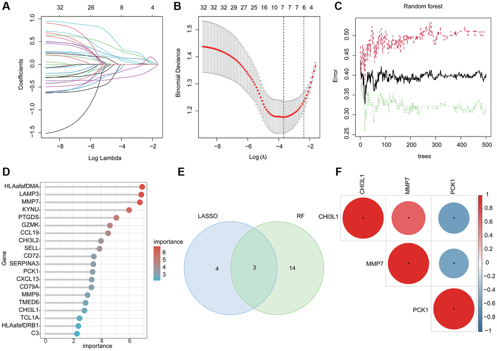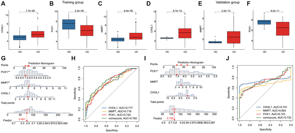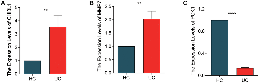 Utilizing the “glmnet” package, a LASSO model was established to identify the feature variables. Then, random forest (RF) algorithm was performed to calculate the importance of each variable. The overlapping genes obtained by RF and LASSO were identified as the feature diagnostic biomarker for UC. Based on the expression profile of the diagnostic biomarker, a nomogram model was established via “glmnet” package. The nomogram score was calculated using the formula: nomogram score = CHI3L1 × 0.33 + MMP7 × 0.48 + PCK1 × −0.35. Package “pROC” was employed to evaluate the diagnostic effectiveness of biomarker for UC.