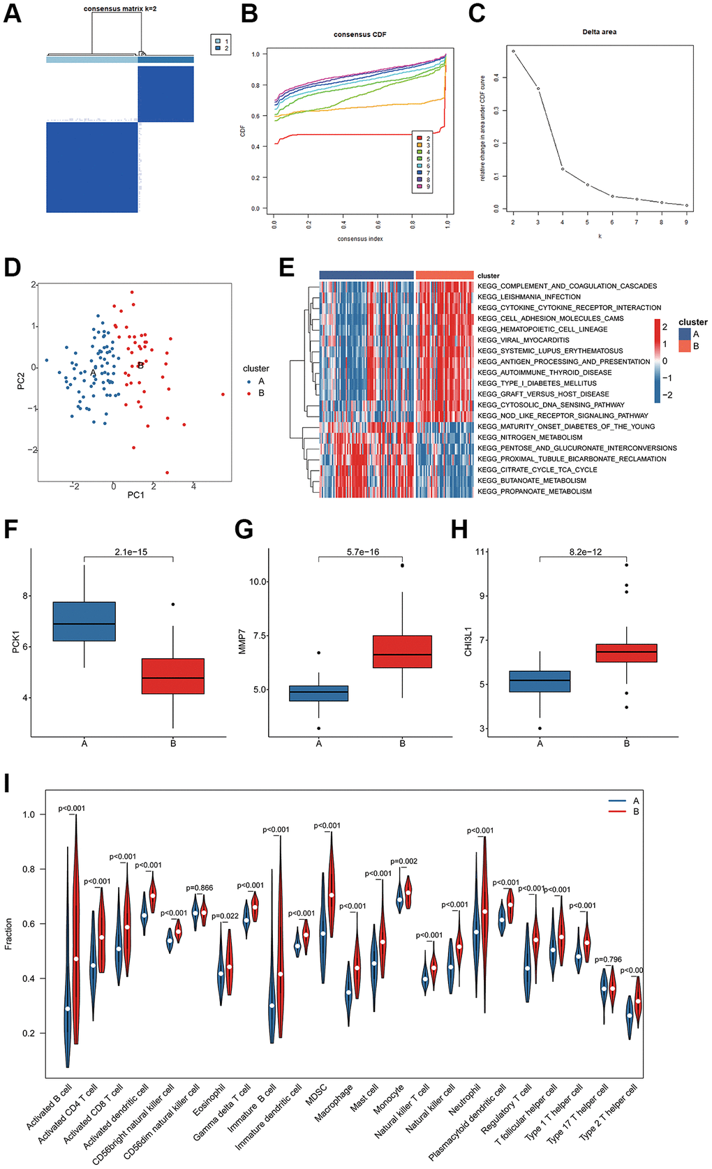 Based on the BRGs related biomarkers, we conducted a consensus clustering analysis of UC samples. Under the optimal classification of K = 2, the UC samples were classified into 2 molecular subgroups (Figure 6A–6C). The PCA diagram displayed a distinct distribution pattern of BRG-based cluster A and cluster B based on the BRGs related biomarkers (Figure 6D). The GSVA result suggested that a series of immune related molecular pathways were greatly upregulated in the cluster B, while some metabolism related molecular pathways were upregulated in the cluster A (Figure 6E). The BRGs related biomarkers expression profile revealed that the expression of PCK1 was down-expressed of UC samples in the cluster B, whereas the expressions of MMP7 and CHI3L1 were over-expressed of UC samples in cluster B (Figure 6F–6H). Immune infiltration analysis of BRGs-based molecular subgroups illustrated that the UC samples in the cluster B had higher immune infiltration level, including activity B cell, CD4+ T cell and CD8+ T cell (Figure 6I).