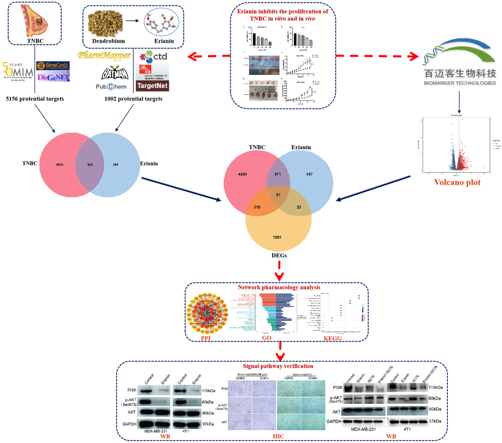 In recent years, network pharmacology has been used to study the pharmacological mechanisms of traditional Chinese medicine. It can mechanically associate drugs and diseases, quantitatively represent the key nodes of the network, including key molecules, key pathways or key modules, and predict the relationship between drugs and disease targets. In this study, we utilized transcriptomics and network pharmacology to explore the antiproliferative mechanism of Erianin in TNBC (Figure 1). First, we evaluated the tumor inhibitory effect of Erianin on TNBC in vitro and in vivo. Next, common targets, hub genes, biological functions and KEGG signaling pathways of Erianin against TNBC were analyzed by network pharmacology and transcriptomics. Furthermore, molecular docking analysis was used to predict the target genes of Erianin. Finally, the results were validated through biological experiments. Then, the PI3K-AKT signaling pathway was validated.
