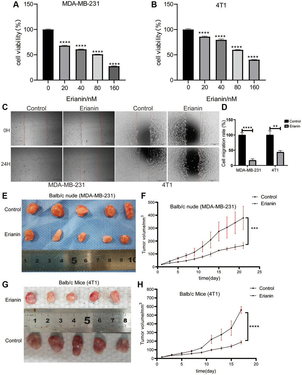 To investigate the antiproliferation of Erianin in TNBC cells, MDA-MB-231 cells and 4T1 cells were treated with different concentrations of Erianin (0, 20, 40, 80, 120, 160 nM) for 24 hours, and the viability of the cells was measured by CCK-8 assay. The results indicated that Erianin had a significant inhibitory effect on the proliferation of MDA-MB-231 and 4T1 cells in a dose-dependent manner (Figure 2A, 2B). Furthermore, we evaluated the effect of Erianin on cell migration. Considering the killing effect of Erianin on TNBC cells, we used 10 nM and 16 nM Erianin to treat MDA-MB-231 and 4T1 cells, respectively. In wound healing assay, Erianin significantly inhibited the migratory ability of MDA-MB-231 and 4T1 cells, compared with the control group (Figure 2C, 2D). In addition, two xenograft transplantation models were used to investigate the antitumor effect of Erianin in vivo. MDA-MB-231 cells and 4T1 cells were injected into Balb/c nude mice and Balb/c mice in situ. When the tumor size reached approximately 15 mm3, the mice were separated randomly into two experimental groups: the control group (DMSO) and the Erianin group. We found that 4 mg/kg Erianin treatment significantly inhibited the tumours growth of MDA-MB-231 and 4T1 cells (Figure 2E–2H).