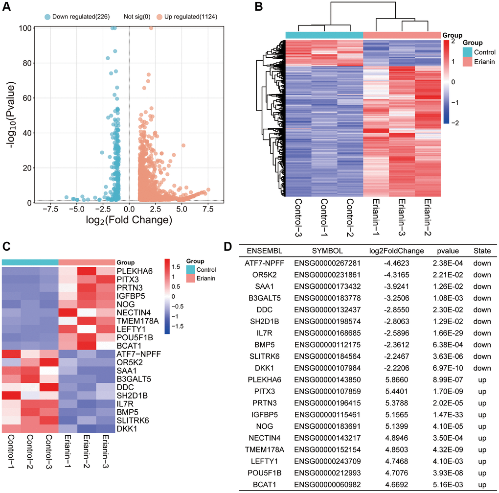 By comparing the gene expression profile data of the Erianin group and Control group, we identified 1350 DEGs out of 13629 transcriptome annotated genes, following the threshold standard of |log2-fold change| > 1 and p < 0.05. The analysis revealed 1124 upregulated genes and 226 downregulated genes. The volcano plot and heatmap of all DEGs were shown in Figure 3A, 3B. To facilitate analysis, we excluded genes that were not expressed in any group from the transcriptome sequencing expression matrix. The top 10 upregulated and downregulated genes were shown in Figure 3C, 3D.