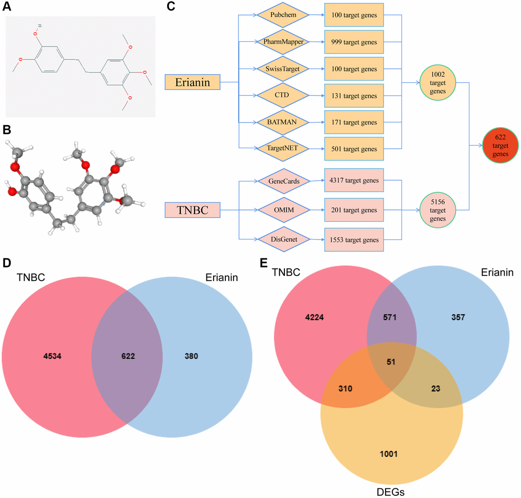We analyzed the target genes of Erianin against TNBC by using network pharmacology. First, we obtained the 2D structure and 3D structure of Erianin from PubChem (Figure 4A, 4B). Then, we obtained a total of 1002 Erianin-related targets from six drug databases and 5156 TNBC-related targets from the GeneCards, OMIM and DisGenet databases (Figure 4C), and the intersection of these two databases led to the identification of 622 Erianin targets in the TNBC-related target genes (Figure 4D). Furthermore, we combined the potential target genes obtained from the network pharmacological analysis and the differential genes analyzed by transcriptome sequencing, and a total of 51 intersections were obtained (Figure 4E). We carried out subsequent analyses of these 51 common targets.