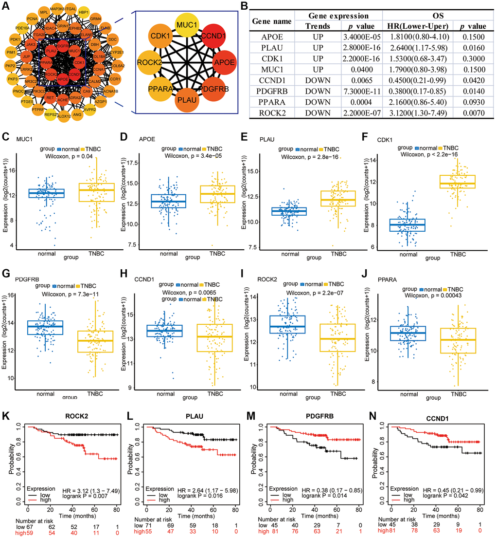 Meanwhile, to explore the genes related to Erianin anti-TNBC progression, we analyzed the target genes of Erianin anti-TNBC using network pharmacology and identified 622 genes shared by Erianin and TNBC. Furthermore, we combined the potential target genes obtained from the network pharmacology analysis and the differential genes analyzed by transcriptome sequencing, and a total of 51 intersections were obtained. To investigate the molecular mechanism and potential targets of Erianin in inhibiting the proliferation of TNBC. We constructed a PPI network on these 51 genes. PPI network analysis screened eight central targets, including CCND1, APOE, PDGFRB, PLAU, CDK1, PPARA, ROCK2 and MUC1. In previous literature, most of these genes have been associated with the onset and progression of TNBC. For example, CCND1 played a significant role in TNBC proliferation, migration, and treatment [39–41]. PDGFRB was found to be significantly upregulated in aggressive TNBC tumor cells and the tumor microenvironment. Inhibition of its expression has been shown to effectively reduce tumor growth and lung metastasis [42, 43]. The cell cycle protein CDK1 was overexpressed in TNBC and may serve as a novel biomarker [41, 44] and therapeutic target for the diagnosis and treatment of TNBC [45]. The PPARA pathway exhibited downregulation in TNBC. Targeting this pathway could serve as a therapeutic strategy for treating TNBC [46]. MUC1 was expressed in TNBC cell lines as a metabolic regulator in TNBC and promotes metabolic reprogramming of glutamine utilization that affects TNBC tumor growth [47]. Targeting tumor MUC1 glycoprotein inhibited the growth of TNBC [48], among others. Meanwhile, these proteins have significant expression differences in TNBC patients; for example, APOE, PLAU, CDK1 and MUC1 were significantly higher in TNBC patients than in paraneoplastic tissues, while PDGFRB, RET, ROCK2, CCND1 and PPARA were significantly lower in TNBC patients than in paraneoplastic tissues. In addition, high expression of ROCK2 and PLAU in TNBC patients predicted poorer survival, while low expression of PDGFRB and CCND1 in TNBC patients predicted poorer survival.