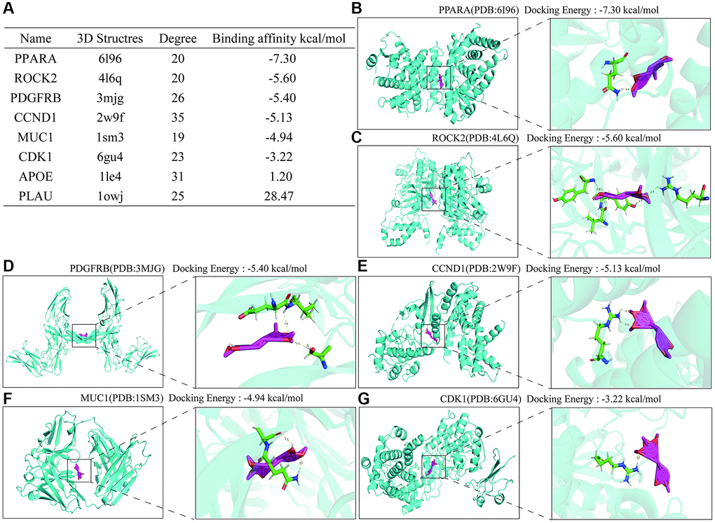 To further clarify the specific targets of Erianin anti-TNBC, we performed molecular docking of these hub genes as target targets with Erianin, and the specific docking binding results were shown in Figure 6A. As shown in the table, Erianin has the lowest binding energy to PPARA, followed by ROCK2, PDGFRB, CCND1, MUC1 and CDK1. The lower docking binding energy indicates that Erianin has a higher binding affinity to these targets, suggesting that it has a greater possibility to act on these targets, affecting the structural changes of the targets and then regulating the corresponding signaling pathways. Docking structures of Erianin with the target proteins PPARA, ROCK2, PDGFRB, CCND1, MUC1 and CDK1 were shown in Figure 6B–6G.