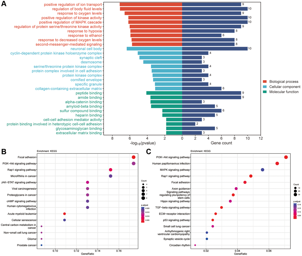 Furthermore, we analyzed GO with KEGG enrichment for 51 common targets and found that there were 2427 results related to BPs, of which 1007 results were significantly different (p < 0.05), 220 results related to CCs, of which 72 results were significantly different (p < 0.05), and 298 results related to MFs, of which 95 results were significantly different (p < 0.05). The GO results are shown in Figure 7A (TOP10). In terms of BP, these genes were enriched in positive regulation of ion transport, regulation of body fluid levels, response to oxygen levels, positive regulation of kinase activity and positive regulation of MAPK cascade. CCs alterations were mainly involved in neuronal cell bodies, cyclin-dependent protein kinase holoenzyme complexes, synaptic clefts, desmosomes and serine/threonine protein kinase complexes. The MFs included peptide binding, amide binding, alpha-catenin binding, amyloid-beta binding and sulfur compound binding. The KEGG results showed that these potential target genes were enriched in a total of 206 pathways, of which 60 pathways were significantly different (p < 0.05), including focal adhesion, the PI3K-Akt signaling pathway, the Rap1 signaling pathway, microRNAs in cancer and human papillomavirus infection (Figure 7B). Among them, focal adhesion and the PI3K-AKT signaling pathway were significantly enriched. In addition, we conducted KEGG enrichment analysis on the differentially expressed genes (DEGs) obtained from transcriptome sequencing and found that the PI3K-AKT signaling pathway was significantly enriched among the DEGs (Figure 7C).