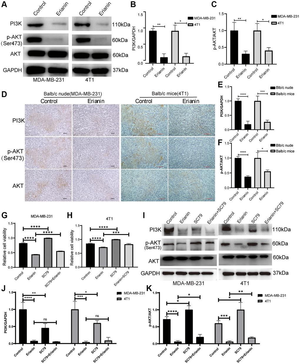 The PI3K-AKT signaling pathway holds significance in responding to extracellular signals and regulating biological processes, including cell proliferation, apoptosis, and migration. Therefore, we explored the regulatory effects of Erianin on the PI3K-AKT signaling pathway by WB and immunohistochemical experiments. We treated two types of TNBC cells with concentrations of Erianin at 40 nM and 80 nM, respectively, which correspond to the half maximal inhibitory concentration for each cell type. Western blot results showed that Erianin significantly inhibited the expression of PI3K proteins and the phosphorylation of AKT after treating MDA-MB-231 and 4T1 cells for 24 hours (Figure 8A–8C). Furthermore, the expression of key proteins in the PI3K-AKT signaling pathway was also detected by immunohistochemistry in both transplantation tumor models, and the results were consistent with those of Western blot analysis (Figure 8D–8F). To further investigate whether Erianin can regulate the progression of TNBC through the PI3K-AKT signaling pathway, rescue experiments were conducted. We incubated TNBC cells with the Akt agonist SC79, CCK-8 assay revealed that 2 ug/ml SC79 treatment significantly reduced the inhibitory effect of Erianin on the proliferation of MDA-MB-231 and 4T1 cells, suggesting that the activation of the PI3K/Akt pathway was associated with the antitumor effect of Erianin (Figure 8G, 8H). Western blot experiments also showed that SC79 significantly enhanced AKT phosphorylation and attenuated the inhibitory effect of Erianin on AKT phosphorylation (Figure 8I–8K). The above results indicated that Erianin may inhibit TNBC cell proliferation by affecting the PI3K-AKT pathway, which confirmed the findings of network pharmacology and transcriptome sequencing.