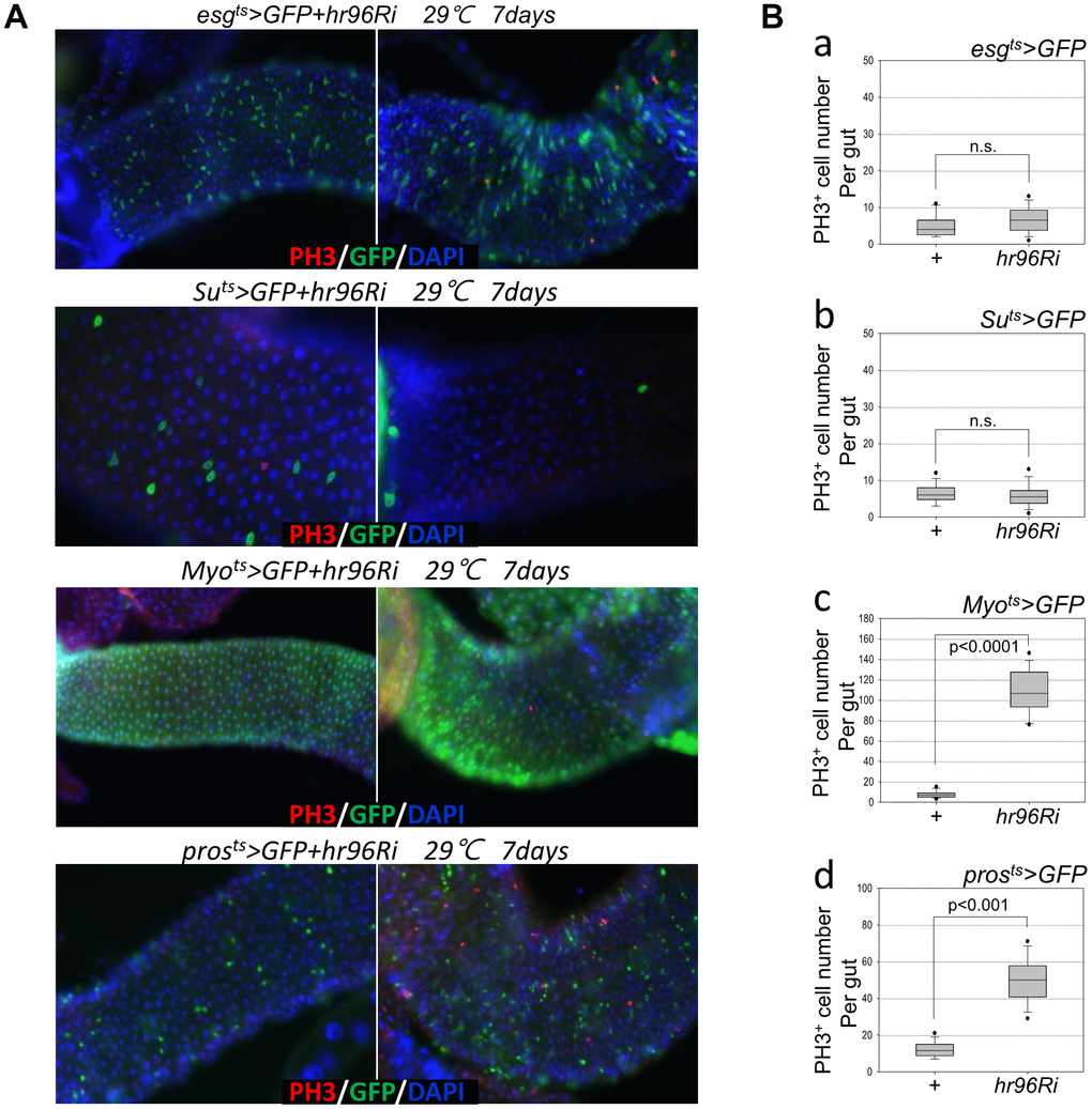 For immunostaining using various antibodies, the entire intact adult gut was dissected and fixed at 25° C. Thereafter, the guts were fixed for 1 h in 4% formaldehyde (Sigma-Aldrich, St. Louis, MO, USA) for anti-GFP antibody staining. For co-immunostaining with primary antibody staining, the whole guts were fixed for 30 min in 4% paraformaldehyde in 1× phosphate-buffered saline (PBS) (Electron Microscopy Science, Hatfield, PA, USA). Subsequently, they were dehydrated for 5 min in 50, 75, 87.5, and 100% methanol, and rehydrated for 5 min in 50, 25, and 12.5% methanol in PBST (0.1% Triton X-100 in 1× PBS) for post-fixing. After washing thrice for 20 min with 1× PBST, the samples were incubated overnight with the primary antibodies at 4° C. After washing thrice for 20 min with 1× PBST, the samples were incubated at 25° C for 1 h with the secondary antibodies and 4′,6-diamidino-2-phenylindole (DAPI; 1;1000; Molecular Probes, Eugene, OR, USA), and washed again thrice for 20 min in 1× PBST. Subsequently, the samples were mounted using Vectashield (Vector Laboratories, Burlingame, CA, USA) and then analyzed using an Axioskop 2 Plus microscope (Carl Zeiss Inc., Göttingen, Germany). The number of PH3+ cells was counted in the whole midgut.