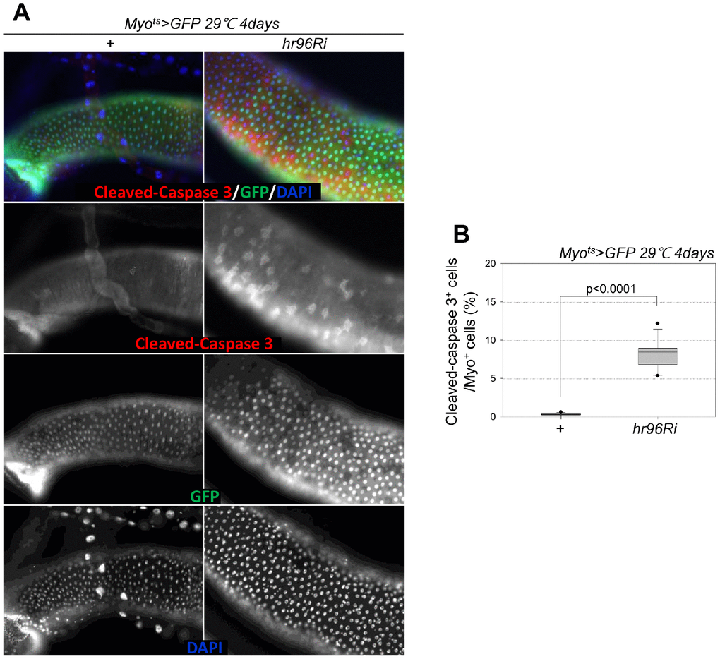 To assess the role of VDR in EC death, cleaved caspase-3 signals were examined; they were increased in the Myo-GFP+ cells of the guts of Myots>GFP and Myots>GFP+VDRRi flies kept at 29° C for 4 days. Very weak cleaved caspase-3 signals were detected in the ECs of Myots>GFP flies (Figure 2A). In contrast to the signal in wild-type Myots>GFP flies, the cleaved caspase-3 signal was markedly increased in the Myo+ cells (ECs) of Myots>GFP+VDRRi flies (Figure 2A). Subsequently, the ratio of cleaved caspase-3+ in Myo-GFP+ cells was quantified. A significant increase in EC death was observed in the gut following EC-specific VDR knockdown (Figure 1B). These results indicate that VDR is required for EC survival under normal conditions.