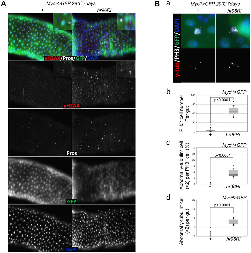 To assess the implications of excessive ISC proliferation due to EC-specific VDR knockdown-induced EC death, damage accumulation in ISCs was analyzed using antibodies against γH2AvD (a molecular marker of DNA double strand breaks) [14, 45], and Pros (an EE marker). The γH2AvD signal was exceedingly low in the Myo-GFP- and Pros- cells (ISCs) of Myots>GFP flies (Figure 3A, left panel); however, γH2AvD foci were markedly increased in the Myo-GFP- and Pros- ISCs of Myots>GFP+VDRRi flies (Figure 3A, right panel). This indicates that the EC-specific knockdown of VDR could induce DNA damage accumulation in ISCs. Centrosome amplification (a hallmark of cancer cells) was also examined using anti-γ-tubulin and anti-PH3 antibodies. In control files, two centrosomes in mitotic ISCs (PH3+ cells) were detected; however, mitotic ISCs with 3–12 abnormal centrosomes were detected in the EC-specific VDR-knockdown flies carrying the Myots>GFP+VDRRi genotype (Figure 3B a). Subsequently, the number of PH3+ cells per gut was quantified, and 114.05 were observed in Myots>GFP+VDRRi flies (N = 20, n = 2281), while 7.33 were observed in Myots>GFP flies (N = 21, n = 154) (Figure 3B b). In addition, the frequencies of these mitotic ISCs with supernumerary centrosomes (>2) were quantified, revealing values of 8.03 and 0.35% in Myots>GFP+VDRRi and Myots>GFP flies, respectively (Figure 3B c). The number of mitotic ISCs with supernumerary centrosomes (>2) per gut was 9.25 in the Myots>GFP+ VDRRi flies and 0.09 in the Myots>GFP flies (Figure 3B d). These results show that VDR inhibition resulted in DNA damage accumulation and a higher incidence of centrosome amplification in ISCs.