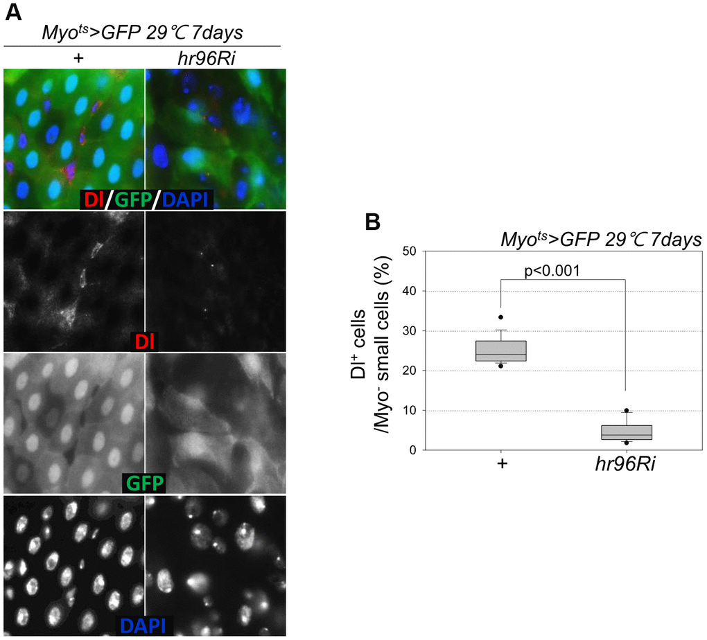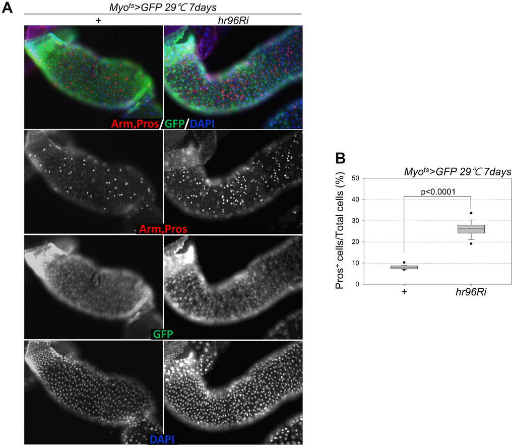 Following EC-specific VDR knockdown, the increase in Dl+ cell numbers in the gut was analyzed using an anti-Dl antibody (Dl is a molecular marker of ISCs). Unlike the previously reported increase in the number of strong Dl+ cells (ISC-EB-EC) following the age-related increase in ISC proliferation [8–10], very weak Dl+ cells and a marked decrease in Dl+ cell numbers in guts with EC-specific VDR knockdown were observed (Figure 4A, 4B). Therefore, to evaluate ISC differentiation in guts with EC-specific VDR knockdown, the number of Pros+ cells in these guts was analyzed using an anti-Pros antibody since Pros is a molecular marker of EE. The number of EEs significantly increased in the guts of Myots>GFP+VDRRi flies compared with the guts of wild-type Myots>GFP flies (Figure 5A and Supplementary Figure 1). Furthermore, the EE ratio in the midgut was quantified. Significant increases in EEs were detected in the guts of EC-specific VDR knockdown flies (Figure 5B and Supplementary Figure 1). This indicates that VDR knockdown in ECs induces an excessive increase in EE numbers. Additionally, we evaluated whether VDR knockdown-induced EE differentiation was ameliorated by VitD treatment. First, to this end, it was determined that VitD could activate the VDR pathway by feeding adult flies with VitD using an anti-hVDR antibody. That is, 7-day-old wild-type flies (Oregon-R) were fed with 100 nM 1α,25-Dihydroxyvitamin D3 for 24 h. In wild-type flies not fed 1α,25-Dihydroxyvitamin D3, VDRs were scattered throughout the intestinal cells, including ECs and EE cells (Supplementary Figure 2, left panels). In contrast, VDRs migrated to the nuclear membrane in the intestinal cells of flies fed 1α,25-Dihydroxyvitamin D3 (Supplementary Figure 2, right panels). Second, we determined whether VitD could activate the VDR pathway in Myots>GFP and Myots>GFP+hr96Ri flies (Supplementary Figure 3). As hypothesized, EC-specific VDR knockdown-induced EE differentiation was ameliorated by VitD treatment (Supplementary Figure 4). These results indicated that the VitD/VDR (Hr96) pathway in fly intestinal models functions similarly to that in mammals. Therefore, VDR is involved in EE differentiation under normal conditions.