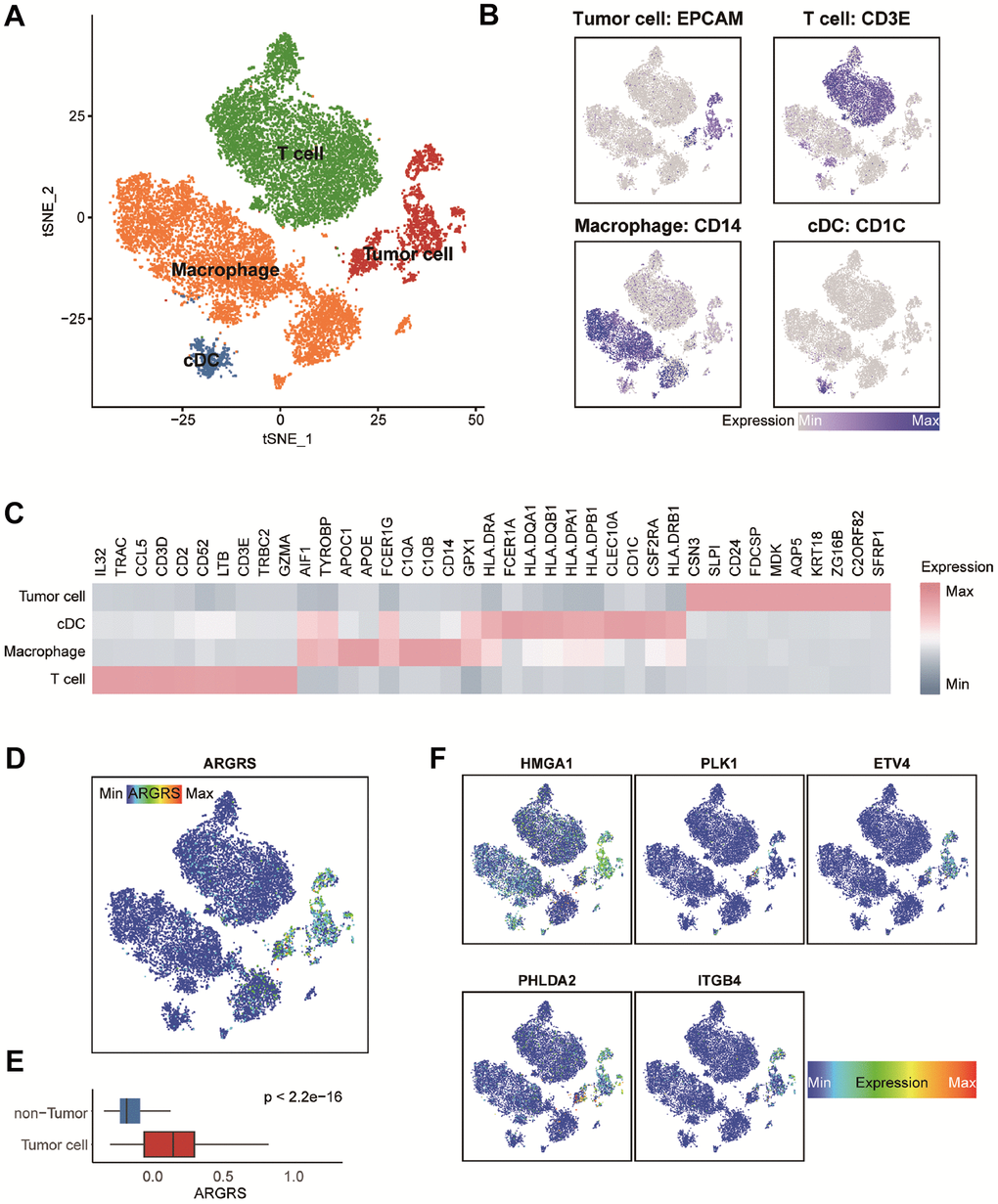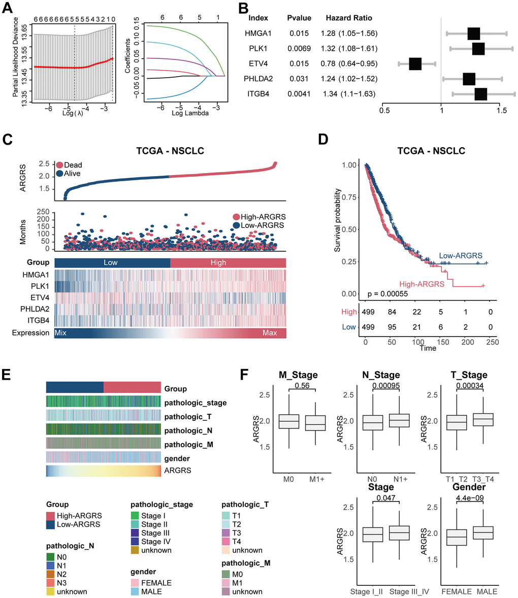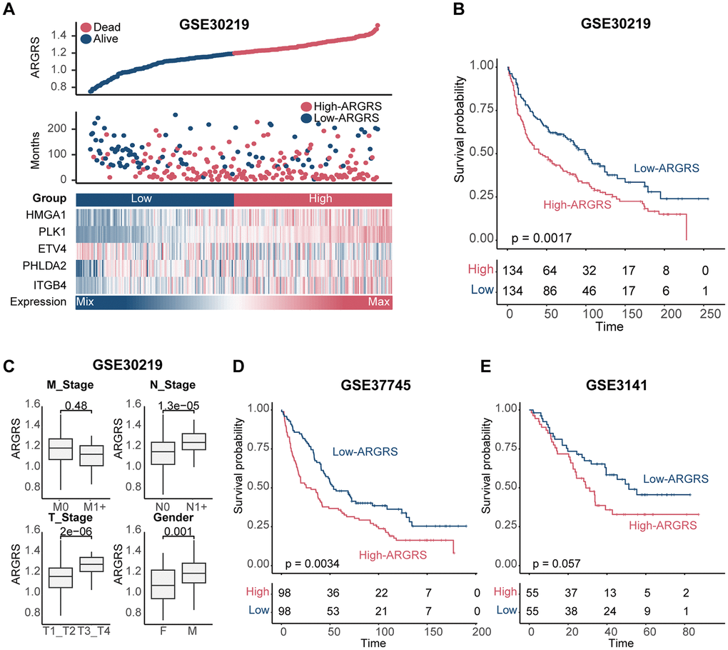 We further confirmed this finding in additional independent cohorts after discovering the prognostic predictive utility of ARGRS in the TCGA cohort. Patients in the GSE30219 cohort who had higher ARGRS had worse OS than those with lower ARGRS, which is consistent with the findings from the TCGA cohort (Figure 3A, 3B). ARGRS levels were also higher in patients with higher clinical stages and grades (Figure 3C), indicating its role in the malignancy of NSCLC. Patients in the ARGRS-high group similarly exhibited inferior clinical outcomes in the GSE37745 and the GSE3141 cohorts (Figure 3D, 3E). Based on the findings from the TCGA and additional independent cohorts, the ARGRS was linked to a worse OS for NSCLC patients and may have contributed to tumor progression.