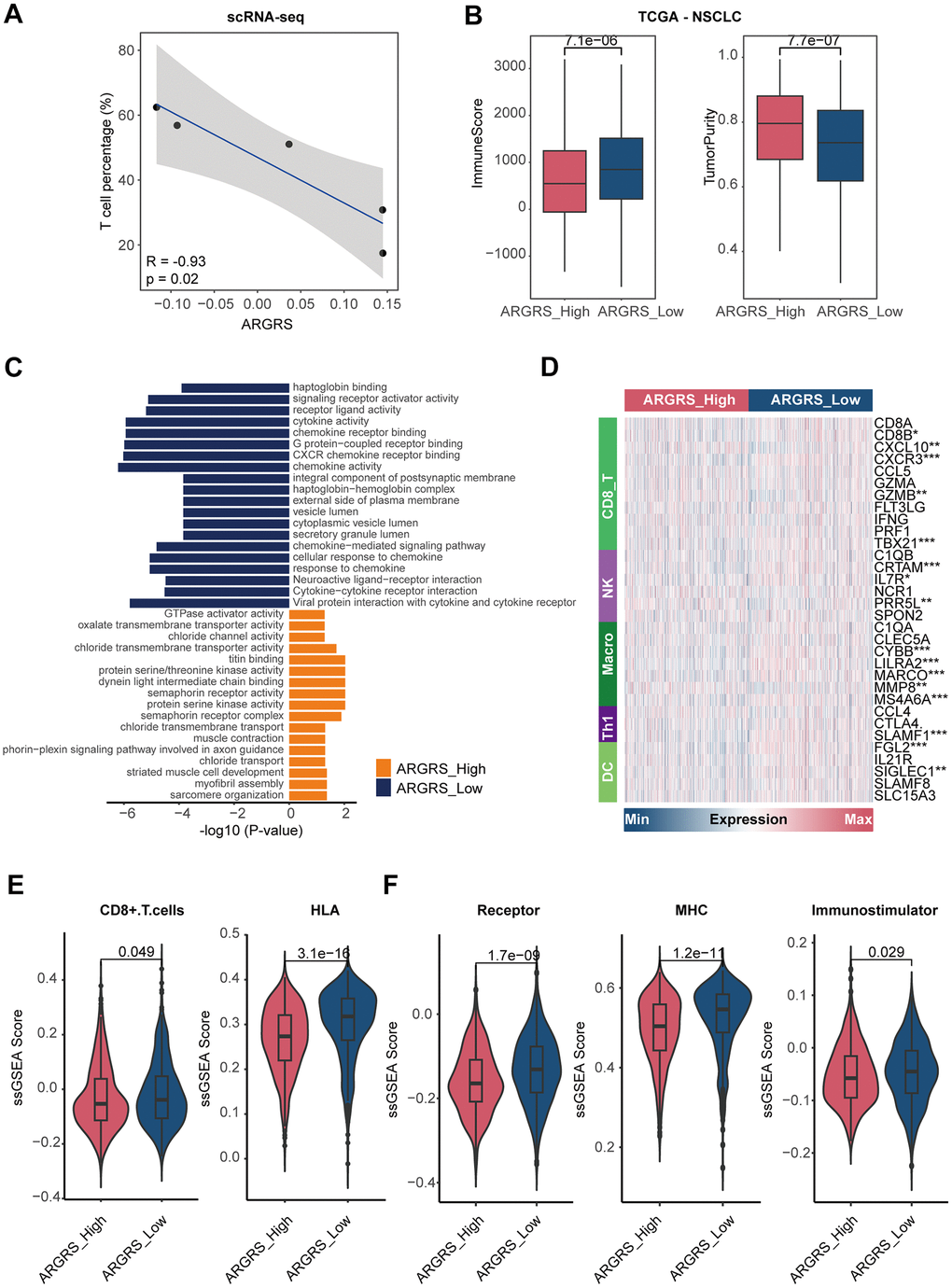 Having observed the existence of many immune cells in the NCLSC patients at the high dimensional datasets, we next explored the correlation between ARGRS and the fraction of each cell type. Notably, the ARGRS was negatively correlated with the fraction of T cells at the single-cell level (R2 = -0.93, p = 0.02, Figure 5A). Also, in the TCGA cohort, patients with higher ARGRS had lower levels of ImmuneScore but higher levels of tumor purity (Figure 5B), consistent with the results found in the single-cell datasets. In addition, a functional analysis of up-regulated genes in ARGRS-low group was highly related to immunological processes, such as cytokine activity, chemokine receptor binding and activity, and cytokine-cytokine receptor interaction (Figure 5C). Meanwhile, compared with the ARGRS-high group, the ARGRS-low group expressed higher transcriptional levels of immunological signatures, such as the biomarkers of CD8+T cells and NK (Figure 5D and Supplementary Figure 6). Also, the ARGRS-low group had higher fraction of CD8+T cells, and enriched some immune activation characteristics, such as the molecules of HLA, MHC, and immunostimulatory (Figure 5E, 5F). To be sum up, combined with the results found at the single-cell and omics transcriptional datasets, we found that ARGRS was negatively correlation with the fraction of T cells, and patients with the ARGRS-high phenotype exhibited low immune infiltration.