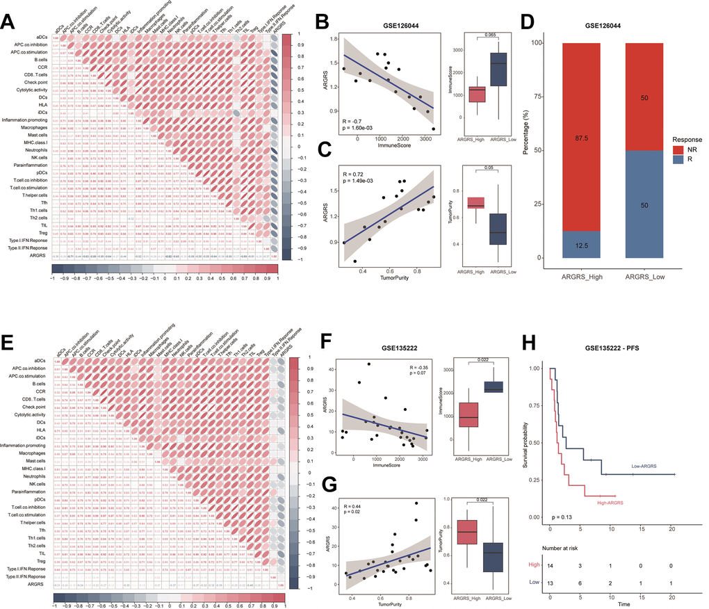 Here, to investigate the immunotherapeutic in the high- and ARGRS-low groups, we downloaded the expression matrix and clinical annotations of NSCLC patients in the cohorts received immunotherapy. In accordance with results above, ARGRS was negatively correlated with almost all immunological characteristics in the GSE126044 dataset (Figure 6A). Also, patients with the ARGRS-high phenotype had higher levels of ImmuneScore, but low tumor purity (Figure 6B, 6C). Besides, patients in the ARGRS-high group were centralized in the NR group (Figure 6D), indicating the immunotherapeutic resistance of them. Consistently, analysis of another immunotherapy cohort also showed the same results. Patients in the ARGRS-high group exhibit lower immune infiltration but higher tumor purity (Figure 6E–6G). Moreover, NSCLC patients in the ARGRS-high group were more likely to recurrence or progress after immunotherapy than the ARGRS-low group (Figure 6H), further supporting the immunotherapeutic resistance of them.