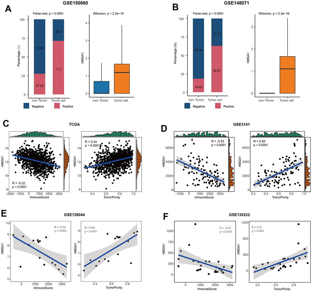 Next, we chose a representative biomarker from the five genes in the model for further experiments. Firstly, we summarized the expressed fraction of these genes at the single-cell levels. Compared with other genes in the model, tumor cells had obviously transcriptional levels and the highest expressed fraction of HMGA1 (Figure 7A, 7B, and Supplementary Figure 9A, 9B). Besides, at the high-resolution dataset, compared with other four genes, HMGA1 showed the most significant negative correlation with T cell inflamed and positive with tumor cells (Supplementary Figure 10). A Additionally, HMGA1 expressed was negatively correlated with ImmuneScore, but positively with tumor purity in multiple independent cohorts (Figure 7C–7F), suggesting the guidance of HMGA1 in distinguishing the hot and cold NSCLC tumors.