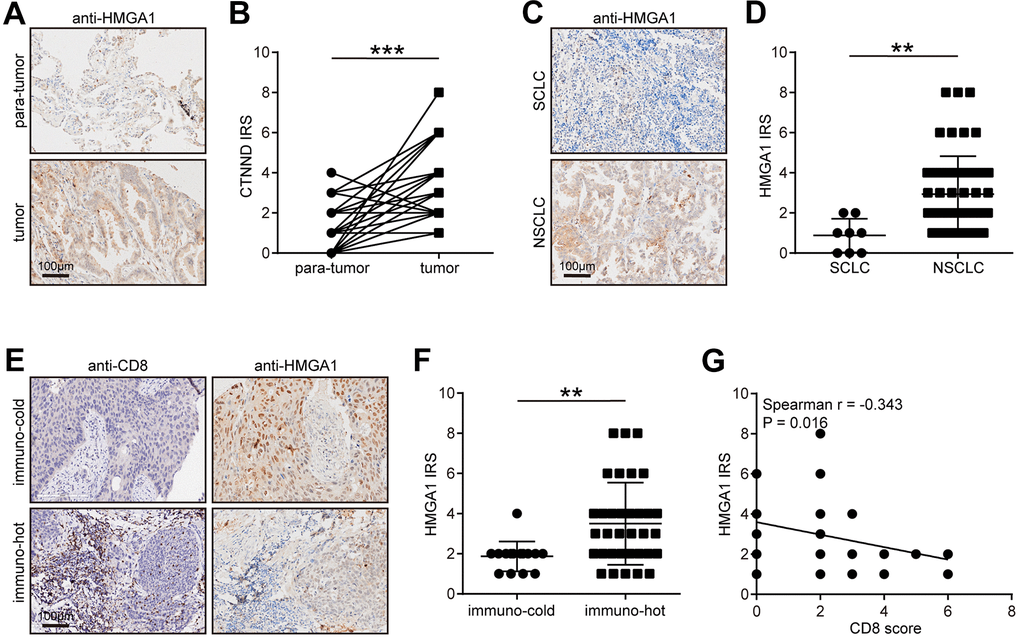Next, we verified the expression pattern of HMGA1 in the in-house cohort. We found that HMGA1 expression was significantly higher in tumor tissues than in para-tumor tissues (Figure 8A, 8B), and HMGA1 was specifically expressed in NSCLC (Figure 8C, 8D). We also classified NSCLC into immune-hot and cold tumors based on the CD8 scores. Besides, HMGA1 was significantly reduced in immune-hot tumors (Figure 8E, 8F) and negatively correlated with CD8 scores (Figure 8G). Overall, the negative correlation between HMGA1 expression and T cell infiltration can be verified in the in-house cohort, which greatly improves the confidence of the public cohort results.