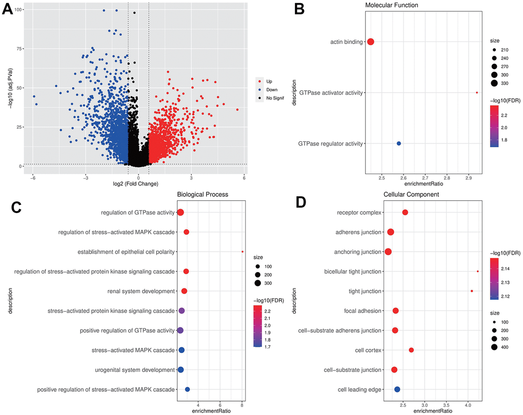 A total of 3211 DEGs were acquired by difference analysis between THCA samples and normal samples of TCGA, in which 721 DEGs were closely correlated to the IGF score (Figure 1A). The Molecular Function of GO enrichment analysis indicated that these genes were closely associated with the actin binding pathway (Figure 1B), the biological process of GO indicated that these genes were closely associated with the activation of regulation of GTPase activity and stress-activated MAPK cascade pathways (Figure 1C), the cellular component of GO displayed that the most of receptor complex, adherens junction, focal adhesion and cell-substrate adherens junction pathway were activated (Figure 1D), implying these genes could be may be closely related to epithelial cell transformation or cancer metastasis.
