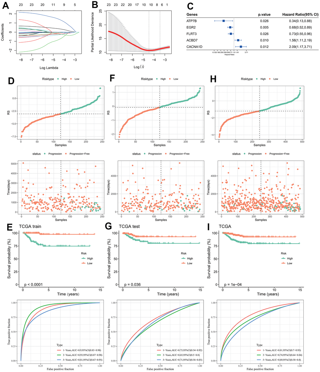 Chi-square test results between the training set and test set indicated no significant difference in clinicopathologic features groups, indicating that our grouping was random and reasonable (p < 0.05, Table 1). 25 genes were retained after IGF score related EDGs filtering. Lasso regression analysis indicated that the number of independent variable coefficients approaching 0 rose together with the progressive increase in lambda (Figure 2A). Ten genes at lambda=0.01147 were chosen as the target genes for the following phase after analyzing the confidence interval under each lambda (Figure 2B). After stepwise regression, five genes were identified as key genes affecting prognosis, namely EGR2, ATP7B, CACNA1D, ACBD7, and FLRT3 (Figure 2C).