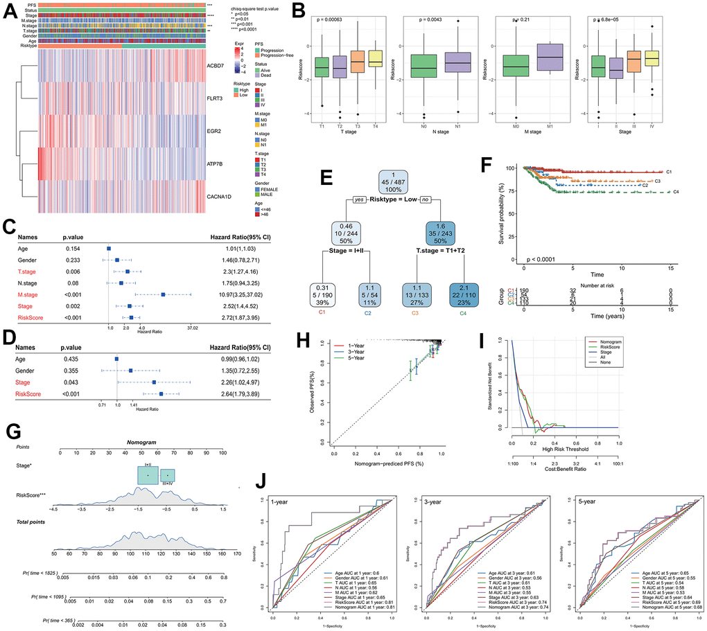 The expression of key genes was compared with the clinicopathological characteristics of RiskScore groups. It was indicated that there were significant differences in T.tage, N.tage, Stage and PFS between RiskScore groups. ACBD7 and CACNA1D as risk factors were significantly expressed in the group with high RiskScore, while FLRT3, EGR2 and ATP7B as protective factor were more actively expressed in the group with low RiskScore (Figure 3A). The RiskScore increased with the increasing clinicopathological grade (Figure 3B). Univariate and multivariate Cox regression analysis indicated that Riskscore and Stage were significant prognostic independent factors (Figure 3C, 3D). We incorporated RiskScore and several clinical features into a decision tree model, which is mainly used to construct a risk hierarchical classifier. Through the decision tree model, the patients were divided into four different clusters (C1, C2, C3, C4), we found that RiskType’s classification ability was superior to other clinical information, followed by T-stage and Stage feature (Figure 3E), indicating the RiskScore is an important risk decision factor. There were significant differences in overall survival among the risk subgroups, with the C1 subgroup having the highest survival rate, followed by C3, C2, and C4 (Figure 3F), indicating that the RiskScore could be a reliable classification indicator.