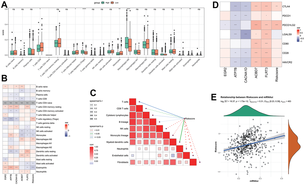CIBERSORT analysis indicated that there were significant differences between the seven immune cells in different groups. The proportions of CD8 T cells, T cells follicular helper, Monocytes and Activated mast cells in the low RiskScore group were significantly higher than those in the high RiskScore group (Figure 4A), indicating that the low-risk patients had more strong immune ability against tumor cells. The correlation between RiskScore and CIBERSORT immune infiltration score showed that the RiskScore was significantly negative correlation to most immune cell infiltration score (Figure 4B), these results are consistent with the results of 22 immune cells infiltration in high-risk patients, the patients with higher RiskScore are associated with worst immune cell infiltration. A substantial inverse relationship between RiskScores and the scores of the majority of immune cells was found by the MCP-Count algorithm, while several model genes exhibited obviously positive correlation to the immune cell infiltration score, such as the ABCD7 and ELRT3 are closely associated with the activated NK cells (Figure 4C). RiskScore, FLRT3, and ACBD7 were found to be positively correlated to most immune checkpoint genes, whereas ATP7B and CACNA1D were shown to be negatively correlated with most of immune checkpoint genes (Figure 4D), suggesting that FLRT3 and ACBD7 are closely associated with the immunotherapy effect and can be developed as a combination target for immunotherapy [35].