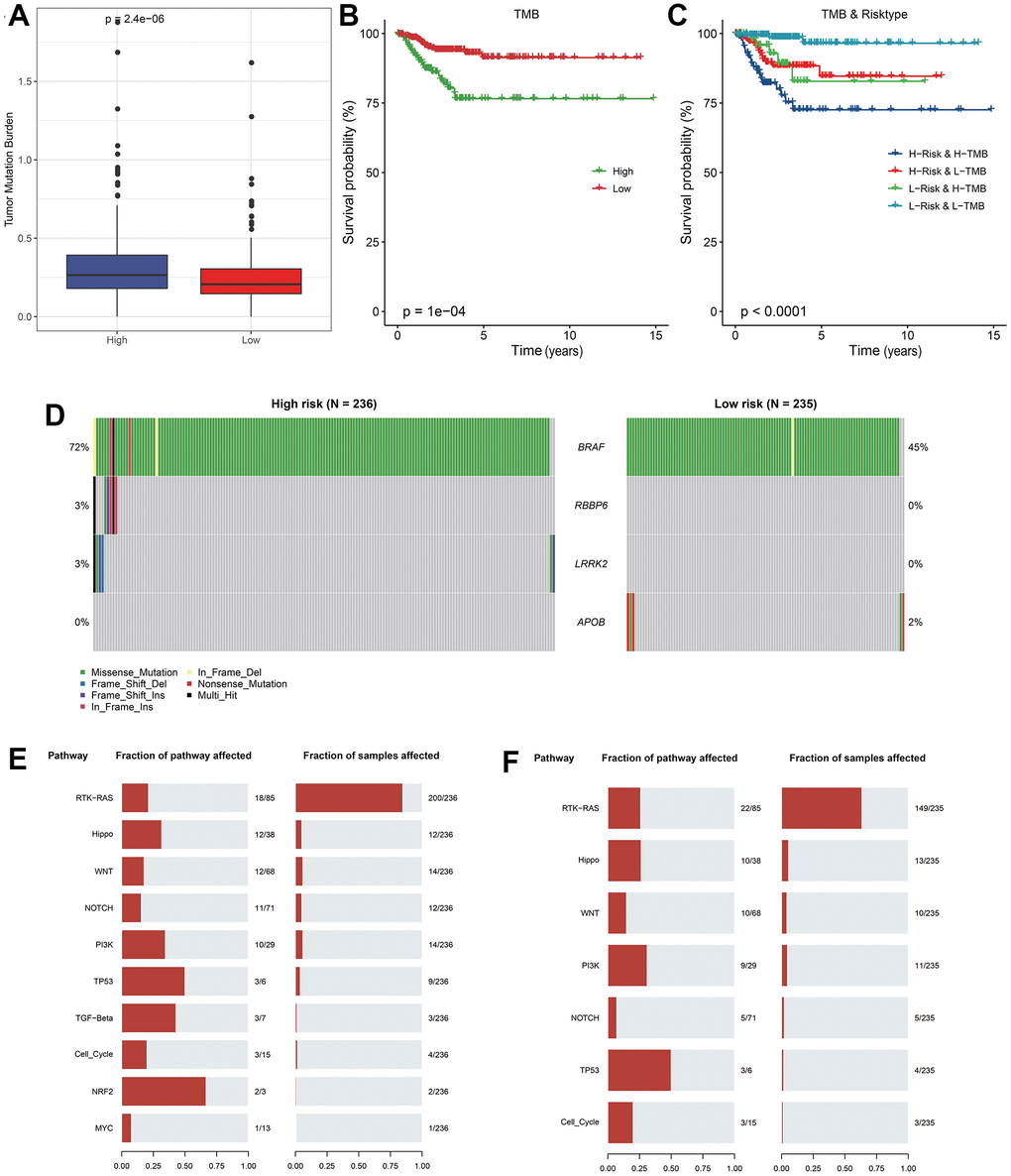 Four genes with high frequency mutation in each subtype were screened. The mutation features of genes in different groups indicated that BRAF gene had a significant mutation frequency in the high RiskScore group, and most of them were missense mutations. Somatic cell changes in tumor-related pathways in the high and low RiskScore groups were evaluated. It was found that the mutation rate in the high RiskScore group was the highest, and the proportion of affected samples was the largest (Figure 5E, 5F), implying that the highly mutation of these classic cancer-related pathway conferred tumor cell with more strong survival and immune suppressive ability in tumor microenvironment.