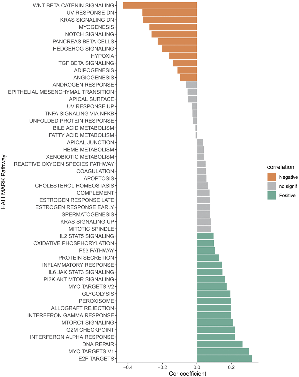 The correlation between RiskScore and pathway score was estimated, and it was found that Wnt-β catenin signaling, UV response, KRAS signaling and Notch signaling, Hypoxia, TGF-β signaling and angiogenesis pathways were significantly negative correlated to the RiskScore (Figure 6). However, the E2F targets, Myc targets-v1/v2, interferon alpha and gamma response, G2M checkpoint, mTORC1 signaling, peroxisome, glycolysis and PI3K AKT MTOR signaling pathways were significantly positive correlated to the RiskScore (Figure 6), implying the tremendous heterogeneity existed in varying risk patients mediated by the different cancer activation pathway.