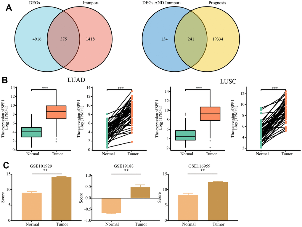 To clarify the expression pattern of SPP1 in NSCLC, the transcriptomic data from TCGA was examined to analyze the expression of SPP1 in normal, LUAD, and LUSC tissues. Figure 1B demonstrated a notable up-regulation of SPP1 in LUAD and LUSC tissues when compared with normal tissues (all p < 0.001). A similar analysis was conducted on the GSE101929, GSE19188, and GSE116959 datasets. The analysis of SPP1 expression in NSCLC, in comparison to normal tissues, also revealed a significant over-expression of SPP1 (all p < 0.01; Figure 1C). Hence, it could be concluded that SPP1 exhibited elevated levels of expression in NSCLC.