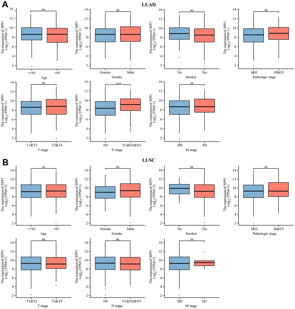 The link between elevated SPP1 expression and NSCLC led to the use of KW analysis to investigate SPP1-related clinicopathological features in LUAD and LUSC. In Figure 2A, a strong association was found between SPP1 and the N stage of LUAD (p < 0.001), whereas no notable correlation was detected with other clinicopathological characteristics. Conversely, Figure 2B indicated no correlation between SPP1 and the clinicopathological features of LUSC.