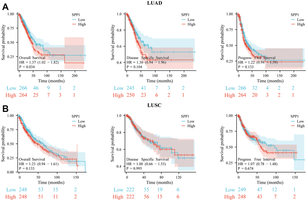 To examine the influence of SPP1 expression on the outlook of NSCLC, survival analysis curves were utilized to assess the overall survival (OS), disease-specific survival (DSS), and progression-free interval (PFI) of individuals diagnosed with LUAD and LUSC. Figure 3A illustrated that the OS of patients with LUAD was diminished in the presence of high expression of SPP1 (HR 1.37 (1.02–1.82), p=0.034). However, the association between SPP1 expression levels and DSS (HR 1.36 (0.94–1.96), p=0.104) and PFI (HR 1.22 (0.94–1.59), p=0.133) in patients with LUAD did not reach statistical significance. According to Figure 3B, there were no notable variances observed in the OS (HR 1.23 (0.94–1.61), p=0.133), DSS (HR 1.00 (0.66–1.53), p=0.995), or PFI (HR 1.07 (0.78–1.48), p=0.674) among LUSC individuals with elevated and reduced SPP1 levels. Consequently, it could be concluded that elevated SPP1 expression impacted the OS of patients with LUAD adversely, whereas the impact on the survival of patients with LUSC did not show statistical significance.