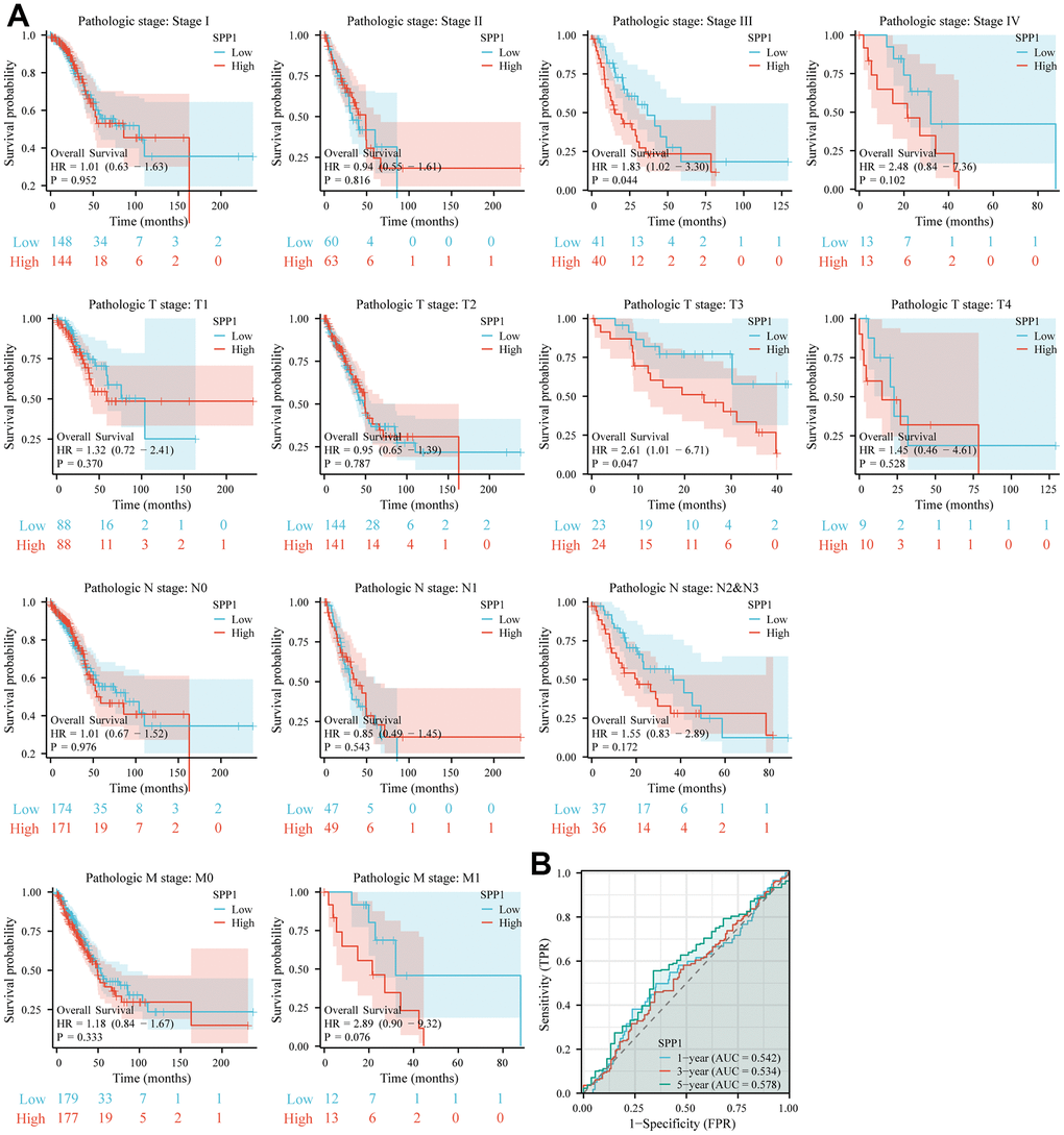 Further analysis was conducted to examine the correlation between the OS of LUAD and SPP1 among different clinicopathological subgroups. Subgroup analysis showed that the higher expression of SPP1 in pathological stage III (HR 1.83 (1.02–3.30), p=0.044) and T stage T3 (HR 2.61 (1.01–6.71), p=0.047) patients was statistically correlated with worse OS, as shown in Figure 4A. Using the ROC curves analysis, the predictive accuracy of SPP1 for LUAD was evaluated in terms of 1-, 3-, and 5-year OS (Figure 4B). Area Under the Curve (AUC) > 0.5 suggested that SPP1 served as a reliable prognostic indicator for LUAD patients, predicting outcomes at 1-, 3-, and 5-year intervals. The AUC under the ROC curves were 0.542, 0.534, and 0.578 in several. The findings demonstrated that SPP1 exhibited slightly superior predictive capability for 1-, 3-, and 5-year survival compared to random prediction, thereby validating the accuracy of the diagnostic prediction. Therefore, the over-expression of SPP1 was considered a risk factor for worse prognosis.