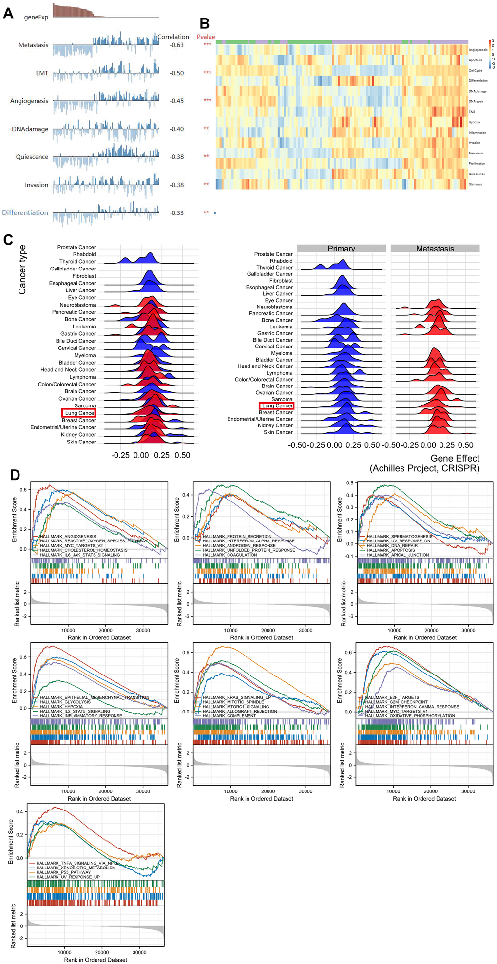 EMTome database (http://ec2-3-231-76-84.compute-1.amazonaws.com/emtome/) was used for the analysis of SPP1 in lung cancer metastasis. To pinpoint crucial pathways connected to tumor metastasis, Gene Set Enrichment Analysis (GSEA) of gene set relevant to metastasis was carried out. A special GSEA-based enrichment analysis approach called Hallmark pathway enrichment analysis was applied.