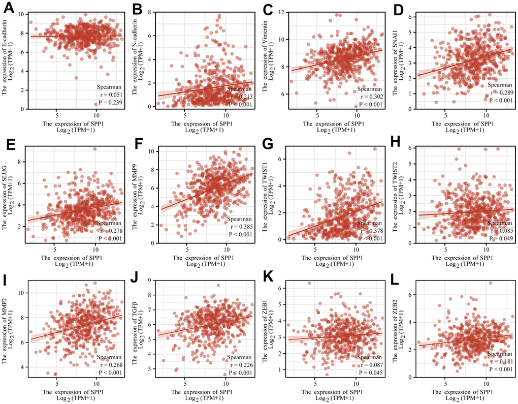 Since SPP1 showed association with OS in patients with LUAD, we performed further analyses, which revealed significant associations between SPP1 expression level and various stages of LUAD. To elucidate the molecular mechanisms of SPP1 in LUAD, CancerSEA and GSEA analyses were performed. Furthermore, we comprehensively analyzed the functional role of SPP1 in LUAD. The results obtained showed a negative correlation between SPP1 expression levels and various cellular processes, including metastasis, EMT, angiogenesis, DNA damage, cancer cell invasion, and cell differentiation. Therefore, our findings enhance comprehension regarding the role of SPP1 and its fundamental mechanism in LUAD cells. Based on the EMTome database, a metastatic analysis revealed an association between SPP1 and metastasis in lung cancer. According to gene enrichment analysis, SPP1 is associated with 34 pathways, one of which is EMT. These results would help further explore the pathophysiological mechanisms of SPP1. Additionally, the upregulation of SPP1 was involved in EMT pathways that were critical for the development of LUAD, including the heightened expression of mesenchymal cell markers (N-cadherin, vimentin), a number of transcription factor families (SNAI1, SLUG, TWIST1, TWIST2, ZEB1, and ZEB2) which controlled how the EMT process was modulated, the overexpression of matrix metalloproteinases (MMP2 and MMP9) and the EMT-related signal transduction pathway (TGF-β). Subsequently, the correlation was examined between the expression of SPP1 and the infiltration of immune cells in LUAD.