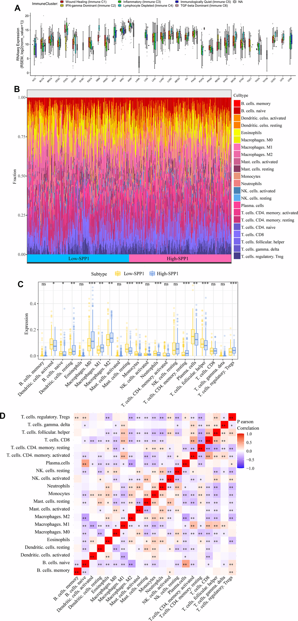 The TISIDB portal website (http://cis.hku.hk/TISIDB/index.php) was utilized to assess tumor-immune interactions and evaluate the relevance of SPP1 expression to immunosuppression and immune activation. Moreover, TISIDB was utilized as a valuable resource to explore potential connections between SPP1 expression and the presence of tumor-infiltrating lymphocytes (TILs) in diverse human cancers. Gene expression profiles were employed to conduct gene set variation analysis, enabling the evaluation of TILs proportions. Spearman test was then used to measure the connection between SPP1 expression and TILs levels.