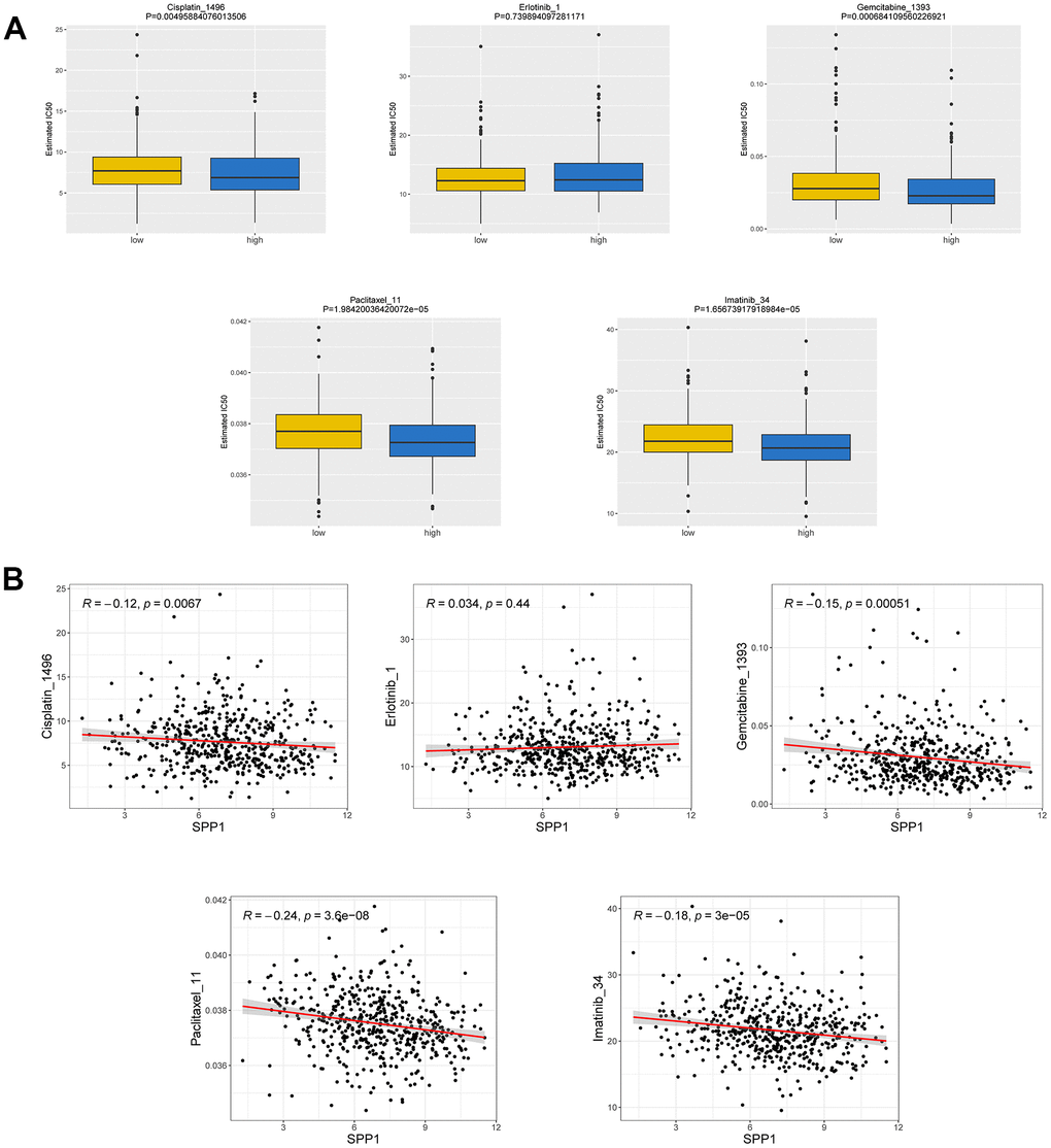 Drug resistance has long been recognized as a major obstacle in LAUD management. To enhance the clinical efficacy of different treatments, it is imperative to subject different chemotherapy drugs to sensitivity analysis. In this study, we analyzed the sensitivity of 367 drugs in the GDSC database. Specifically, 510 samples in the TCGA-LUAD dataset were categorized into the high and low expression groups based on the expression levels of the SPP1 gene, and subsequently, IC50 values were calculated. Remarkably, we observed that the IC50 values of 127 drugs exhibited significant disparities between the high and low SPP1 expression groups, including notable drugs, such as gemcitabine and cisplatin (Figure 9). Spearman correlation analysis also showed a significant negative correlation between SPP1 expression level and the two drugs, gemcitabine and cisplatin. This finding suggested that tumors with elevated SPP1 expression levels show heightened sensitivity to gemcitabine and cisplatin, rendering them more likely to respond favorably to these treatments compared with counterparts with low SPP1 expression levels. Moreover, these findings provided valuable insights for tailoring personalized treatments for individual patients with LUAD. However, further research is required to validate these observations and elucidate the underlying associated mechanisms.