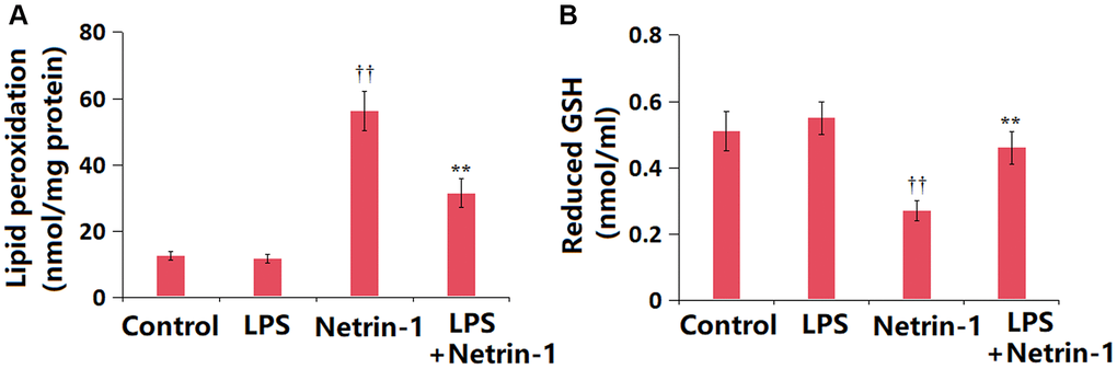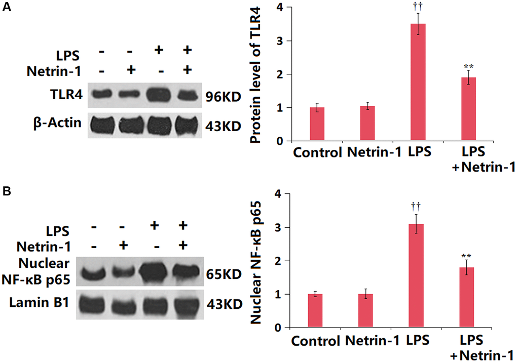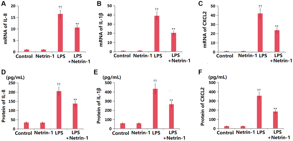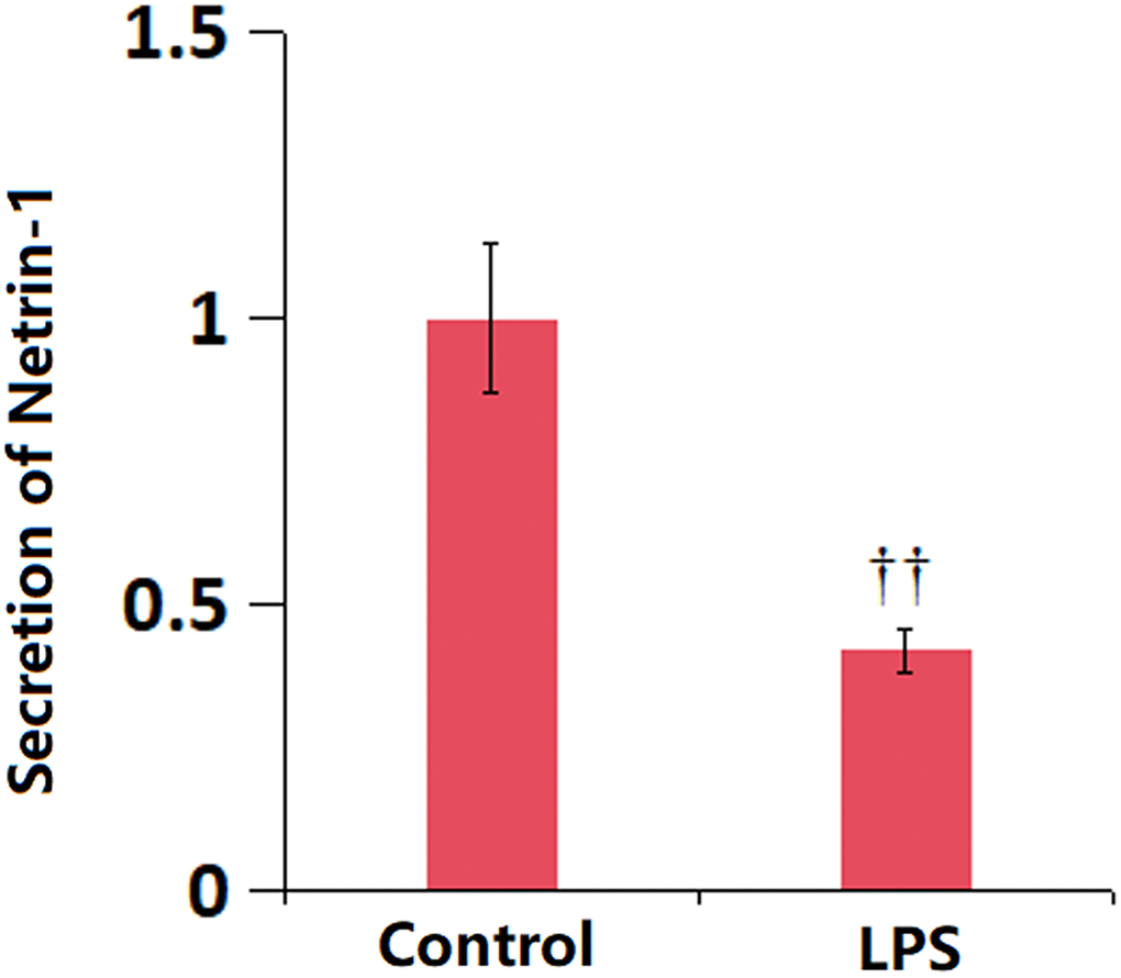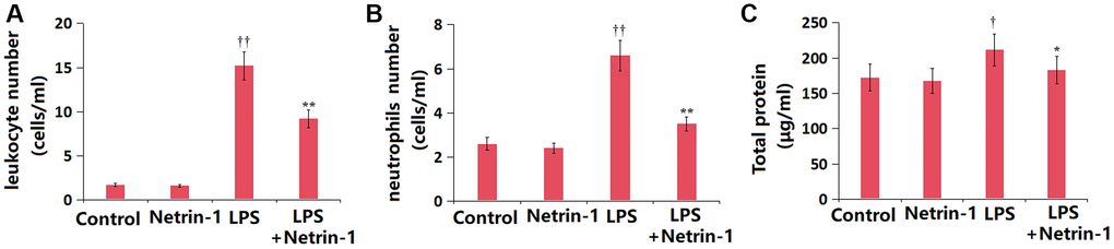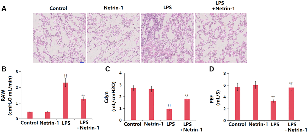The mice were divided into 4 groups: Vehicle, NT-1, LPS, and LPS+NT-1. In the NT-1 and LPS+NT-1 groups, normal mice and LPS mice were intraperitoneally injected with 80 μg/mL mouse Netrin-1 protein (R&D, 1109-N1-025, USA) for 1 week before the ALI model induction. In the vehicle and LPS groups, normal mice and LPS mice were injected with the same volume of normal saline [20].