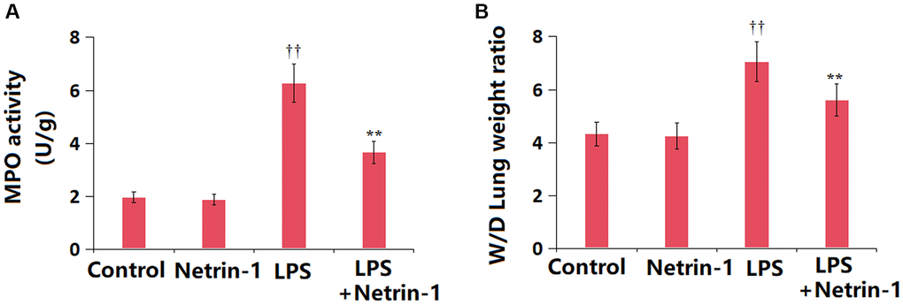 The activity of MPO was changed from 1.96 to 1.87 U/g in the NT-1 group, was notably increased to 6.27 U/g in ALI mice, then remarkably reduced to 3.65 U/g by NT-1 (Figure 3A). Furthermore, the lung W/D ratio in the control, NT-1, ALI, and NT-1+ALI groups was 4.31, 4.25, 7.05, and 5.61, respectively (Figure 3B).