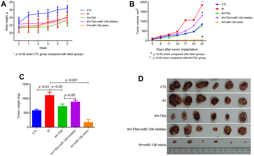 The body weight of mice reduced following the IH exposure (Figure 2A, p < 0.05). The IH-induced increased tumor volume can be decreased by TSA or miR-138 mimic administration. Furthermore, an miR-138 inhibitor interrupted the therapeutic efficacy of TSA in tumor volume (Figure 2B, p < 0.05). Mice in the IH group displayed the highest tumor weight; TSA intraperitoneal injection and miR-138 mimic intratumoral injection significantly contributed to reduce tumor weight (p < 0.05 and p < 0.001). The therapeutic function of TSA was disturbed following the intratumoral injection of a miR-138 inhibitor (p < 0.05) (Figure 2C). The tumor images of each group are displayed in Figure 2D.