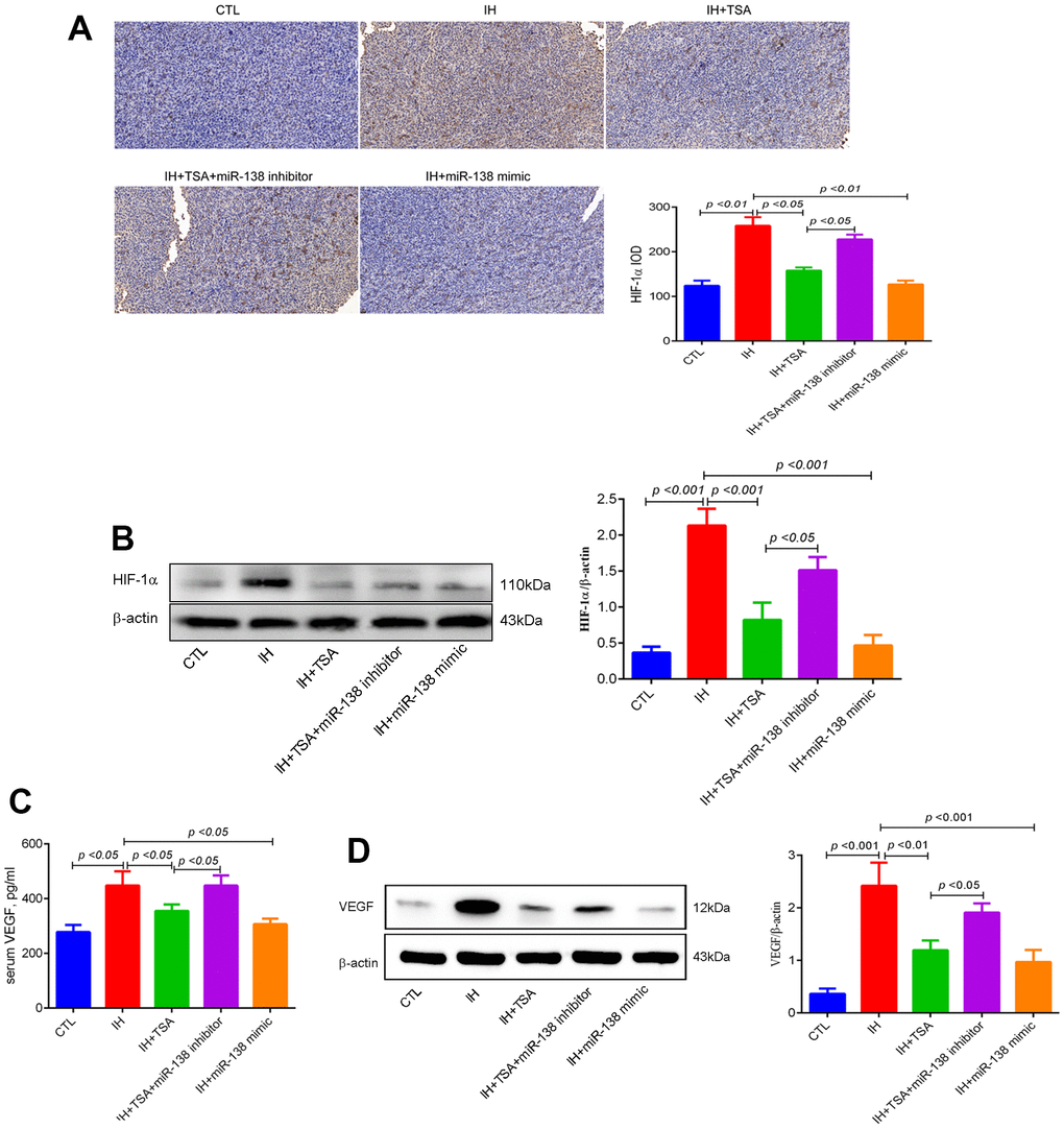 IHC and Western blotting results demonstrated that IH-induced high HIF-1α levels. Under the IH condition, TSA and miR-138 mimic decreased HIF-1α levels (all p < 0.05), and the miR-138 inhibitor partly abolished the TSA function by increasing the levels of HIF-1α (p < 0.05) (Figure 4A, 4B). The expression of VEGF both in the serum and tumor tissue in the IH group increased (p < 0.05 and < 0.001). Similar to HIF-1α, the expression of VEGF decreased following the administration of TSA or miR-138 mimic under IH conditions. Subsequently, the reduced VEGF levels were partly upregulated by a miR-138 inhibitor (p < 0.05) (Figure 4C, 4D).
