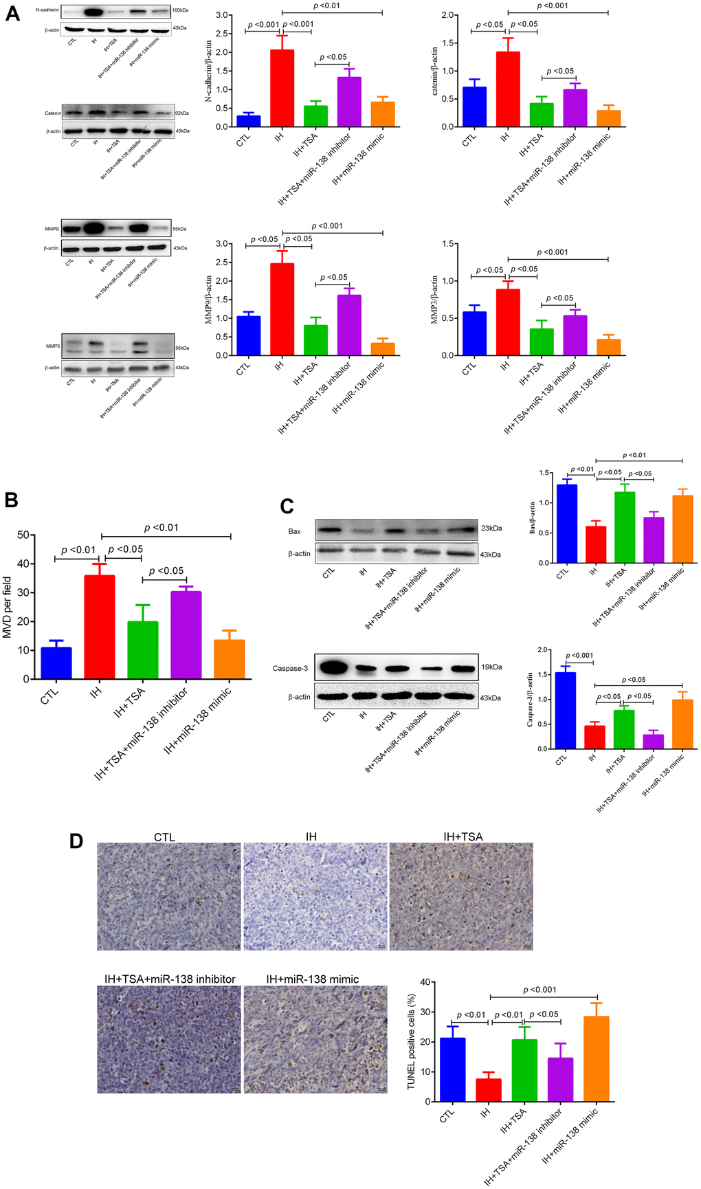 Western blotting results illustrated that the levels of N-cadherin, catenin, MMP9, and MMP3 increased in IH mice. Similar to the 138-mimic, TSA reduced the expression under IH conditions. The results demonstrated that TSA attenuated IH-induced tumor migration and invasion (Figure 5A). Figure 5B demonstrates that IH-induced high MVD levels were partly reversed by TSA or miR-138 mimic administration. IH contributed to low apoptosis levels, as evident from the reduced levels of BAX and Caspase-3, and TUNEL levels in the IH group; both TSA and miR-138 increased the apoptosis under IH condition (Figure 5C, 5D). The effect of TSA on tumor migration, invasion, MVD, and apoptosis was significantly reversed by miR-138 mimic under IH conditions, indicating that TSA attenuated tumor migration, invasion, MVD, and increased apoptosis via miR-138.